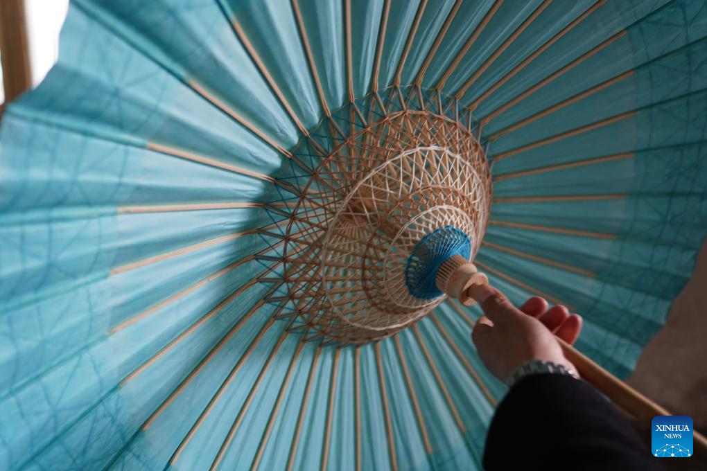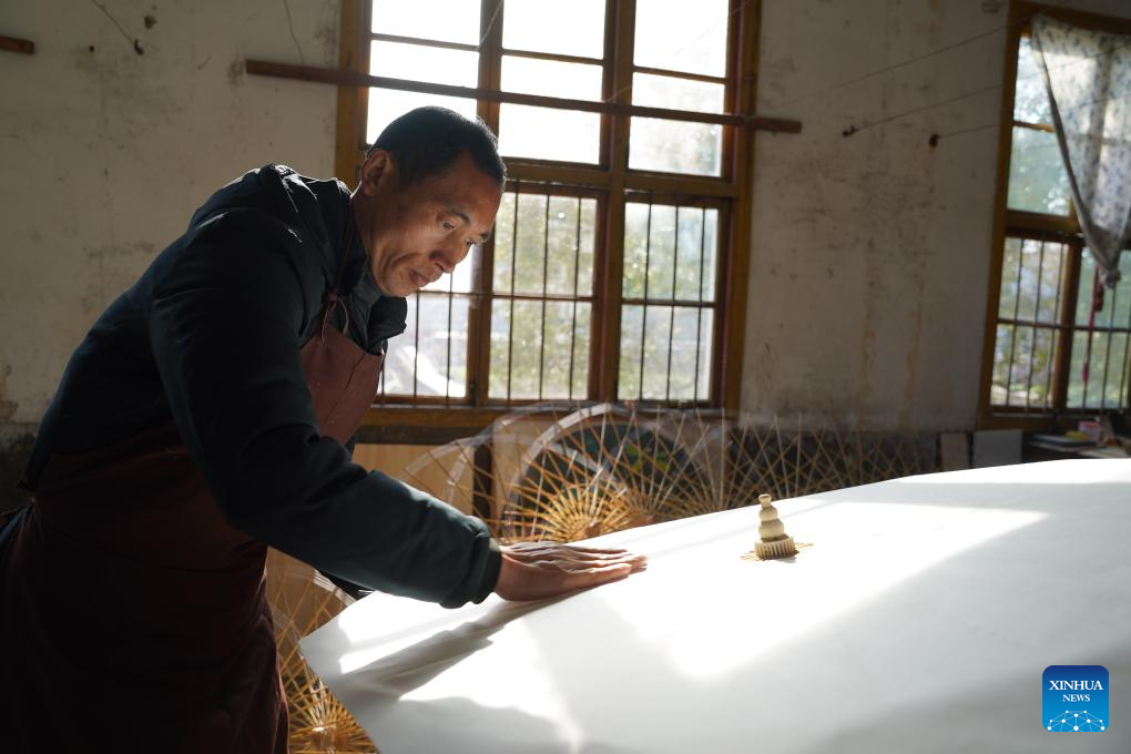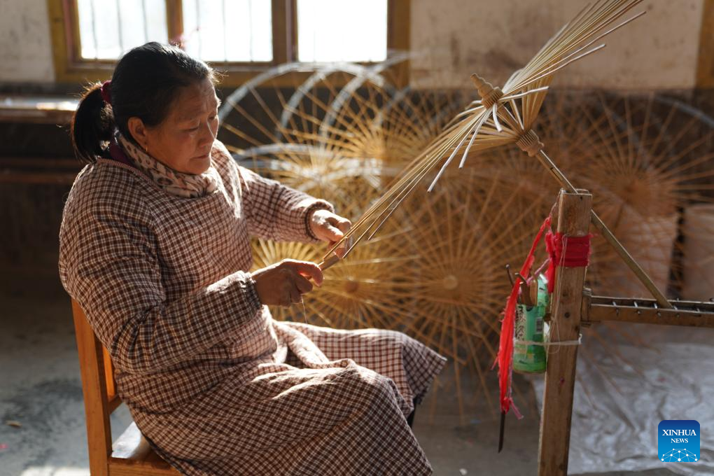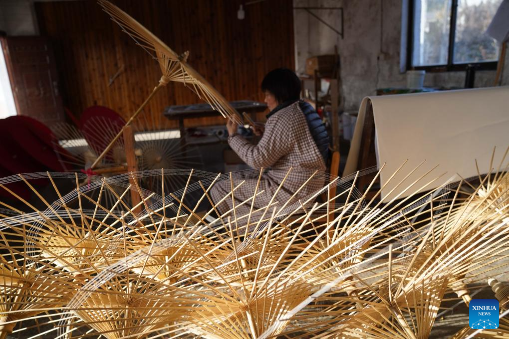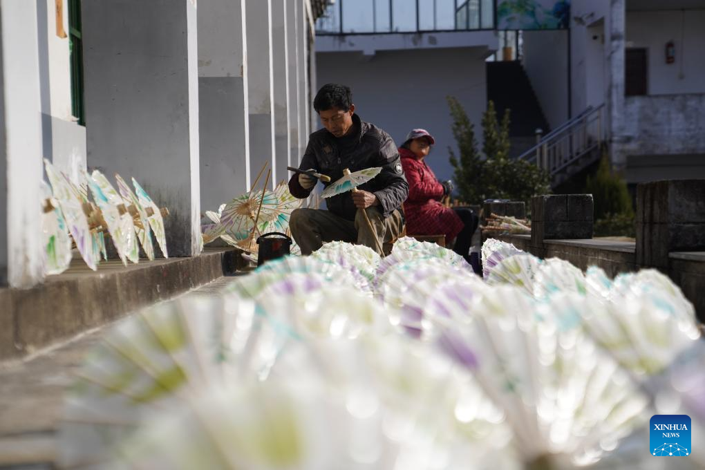 A man assembles a Jialu paper umbrella in Wuyuan, east China's Jiangxi Province, Jan. 10, 2024. (Xinhua/Zhou Mi)