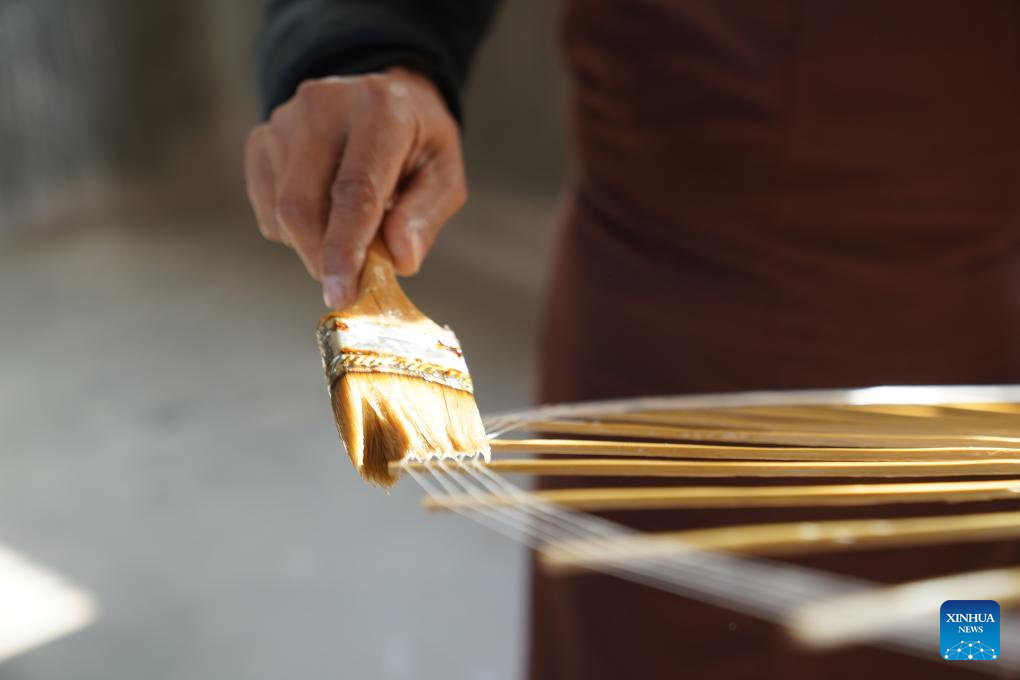 A man applies glue to a bamboo frames while making a Jialu paper umbrella in Wuyuan, east China's Jiangxi Province, Jan. 11, 2024. (Xinhua/Zhou Mi)