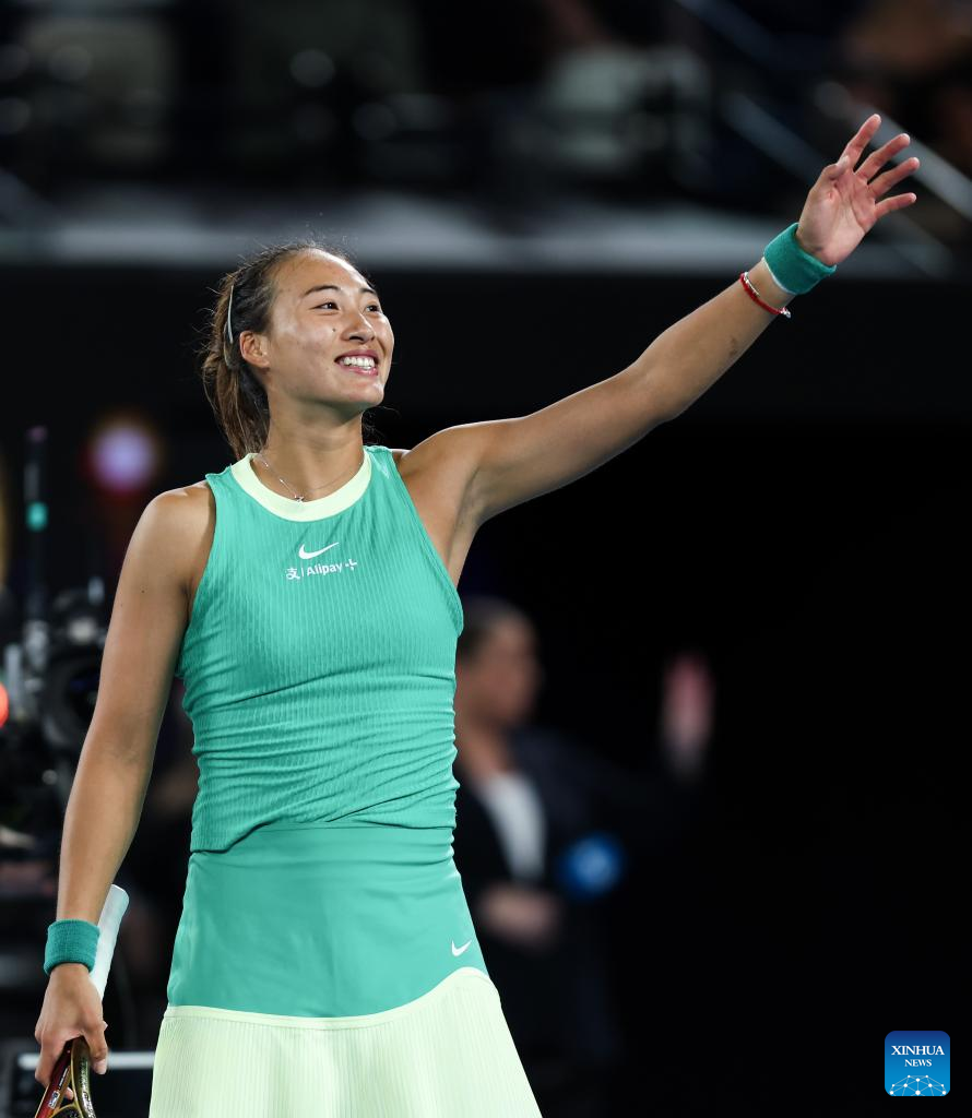 Zheng Qinwen of China greets spectators after winning the women's singles quarterfinal against Anna Kalinskaya of Russia at Australian Open tennis tournament in Melbourne, Australia, Jan. 24, 2024. (Xinhua/Ma Ping)