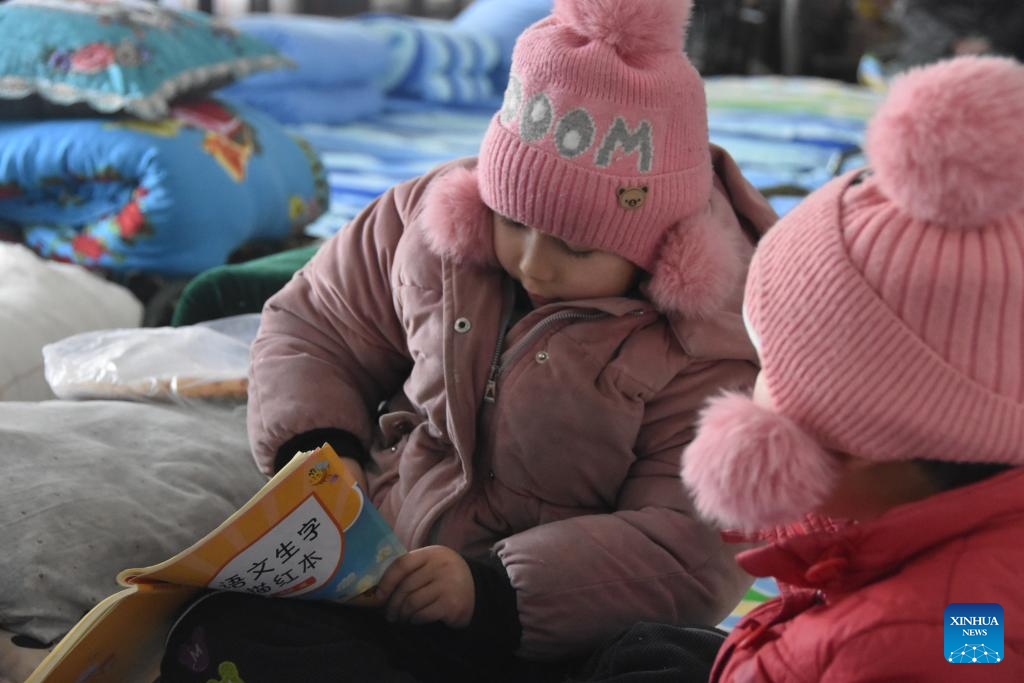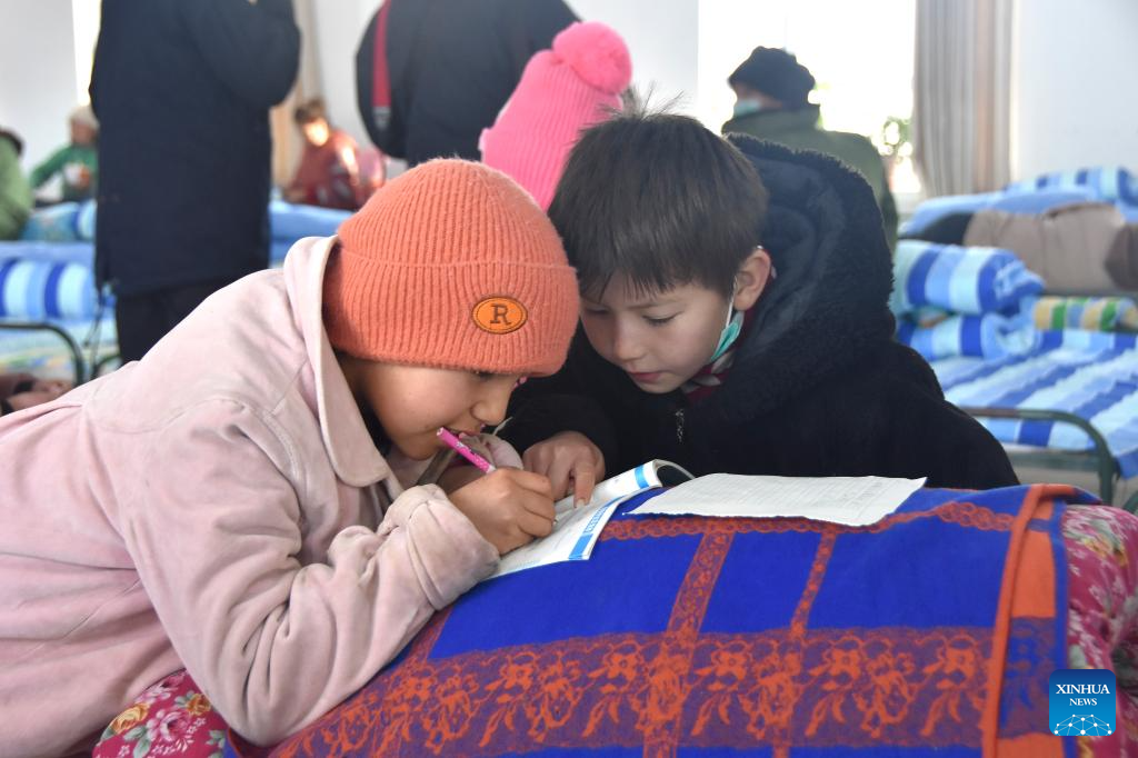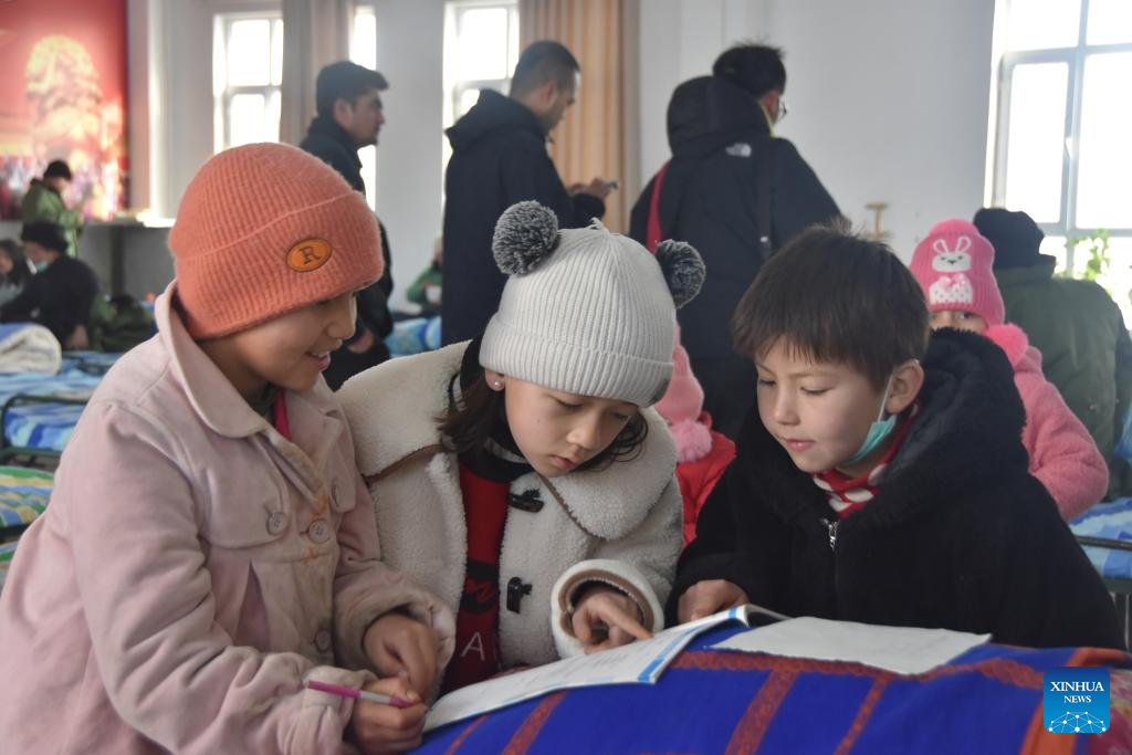 Children do homework at a resettlement site in Wushi County, northwest China's Xinjiang Uygur Autonomous Region, Jan. 24, 2024. (Xinhua/Gu Yu)