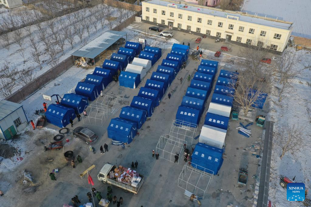 An aerial drone photo shows staff members setting up tents at a resettlement site in Wushi County, northwest China's Xinjiang Uygur Autonomous Region, Jan. 24, 2024. (Xinhua/Su Chuanyi)