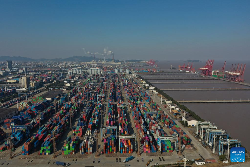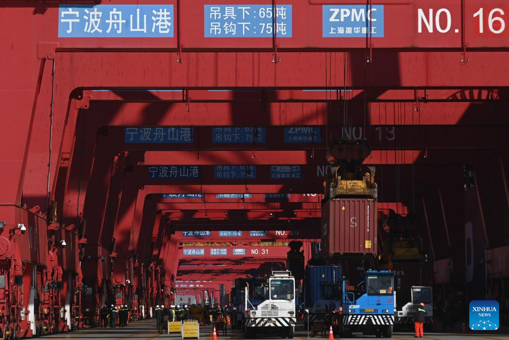 Cranes and trucks work at a container terminal at the Meishan port area of the Ningbo-Zhoushan Port in east China's Zhejiang Province, Jan. 24, 2024. (Xinhua/Huang Zongzhi)