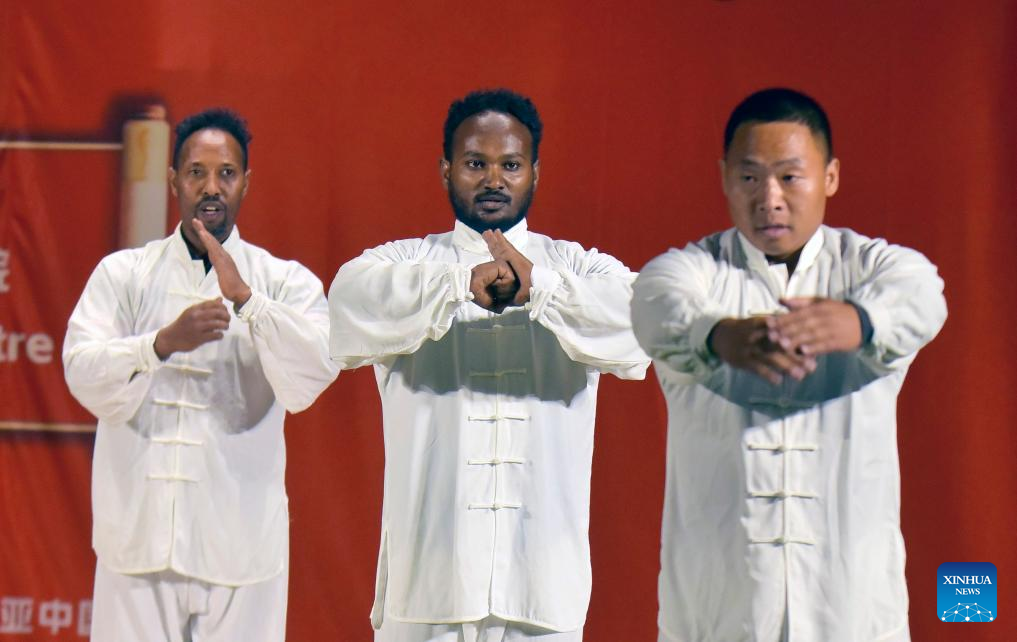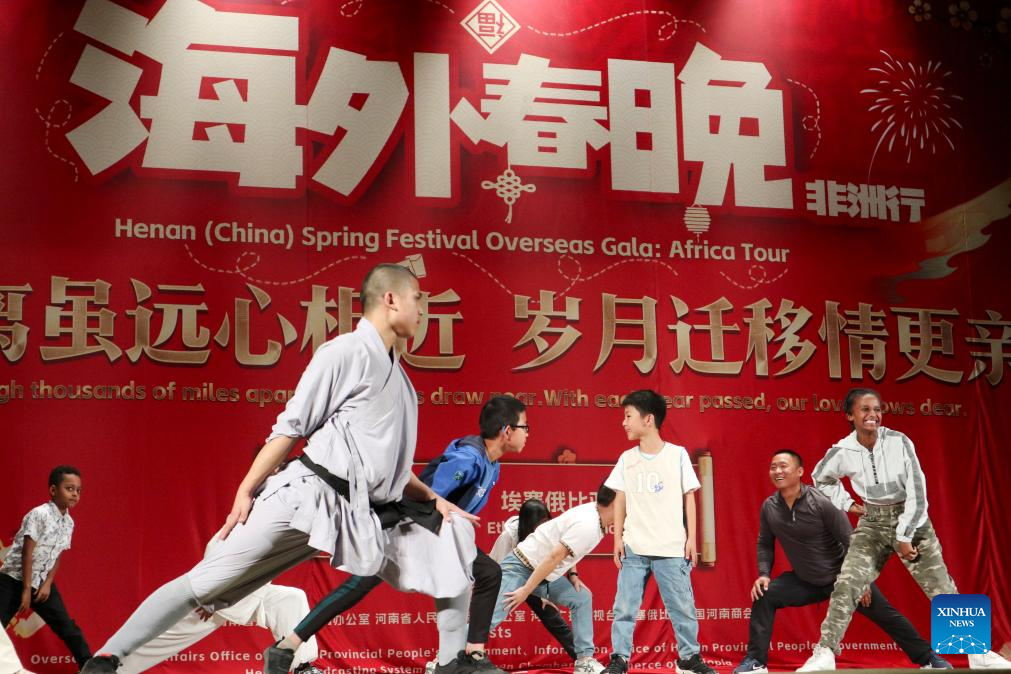 Chinese and local performers demonstrate martial arts in Addis Ababa, capital of Ethiopia, Jan. 23, 2024. A cultural troupe from central China's Henan Province staged a stunning performance in the Ethiopian capital of Addis Ababa Tuesday as part of the Spring Festival -- the Chinese New Year -- celebrations. (Photo by Michael Tewelde/Xinhua)