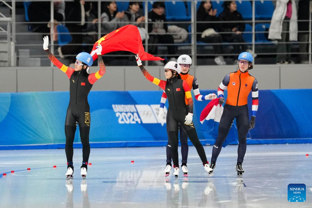 Liu Yunqi (2nd L) of team China competes during the mixed relay final of speed skating event at the Gangwon 2024 Winter Youth Olympic Games in Gangneung, South Korea, Jan. 25, 2024. (Xinhua/Zhu Wei)