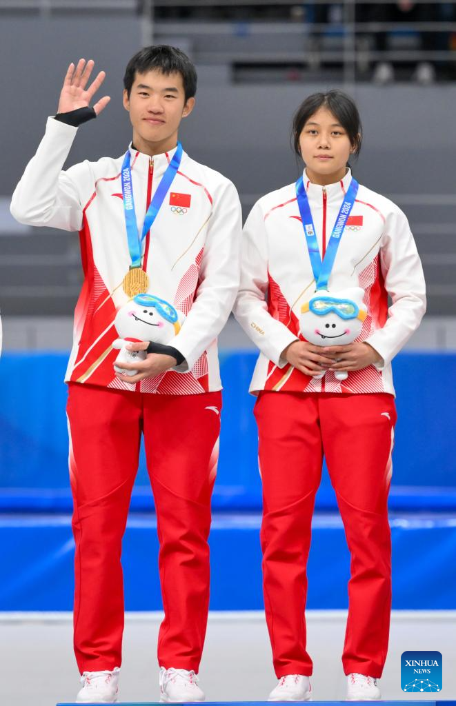 Pan Baoshuo (L) and Liu Yunqi of team China pose during the victory ceremony after the mixed relay final of speed skating event at the Gangwon 2024 Winter Youth Olympic Games in Gangneung, South Korea, Jan. 25, 2024. (Xinhua/Zhu Wei)