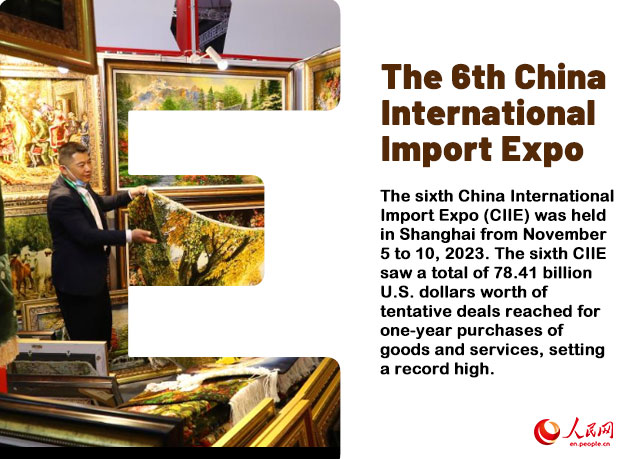 The sixth China International Import Expo (CIIE) was held in Shanghai from November 5 to 10, 2023. The sixth CIIE saw a total of 78.41 billion U.S. dollars worth of tentative deals reached for one-year purchases of goods and services, setting a record high.