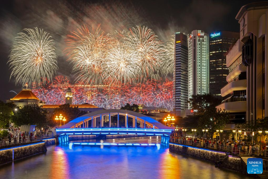 Fireworks light up the sky over the Marina Bay in Singapore, Aug. 9, 2023. (Photo by Then Chih Wey/Xinhua)