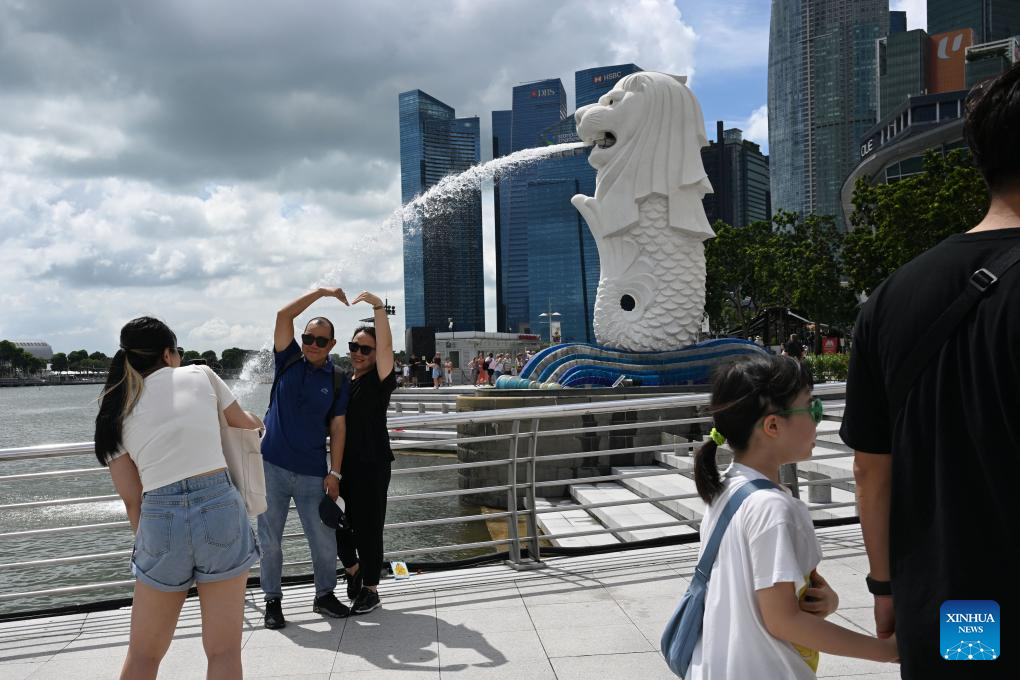 Tourists visit the Merlion Park in Singapore on Dec. 21, 2023. (Photo by Then Chih Wey/Xinhua)