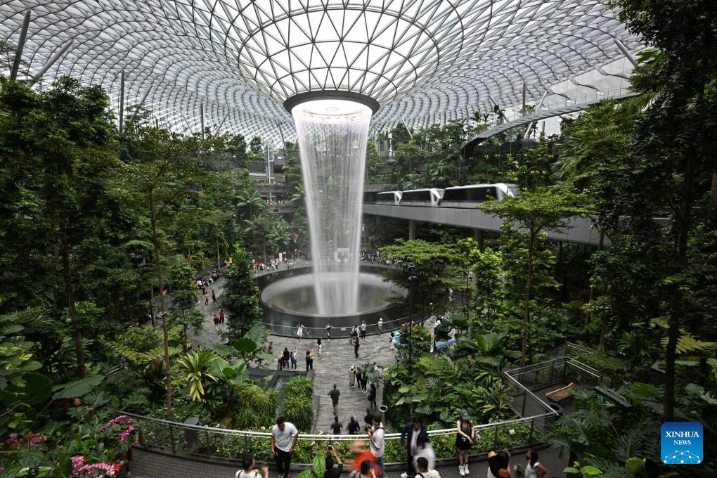 Tourists visit the Jewel Changi Airport in Singapore on Sept. 7, 2023. (Photo by Then Chih Wey/Xinhua)