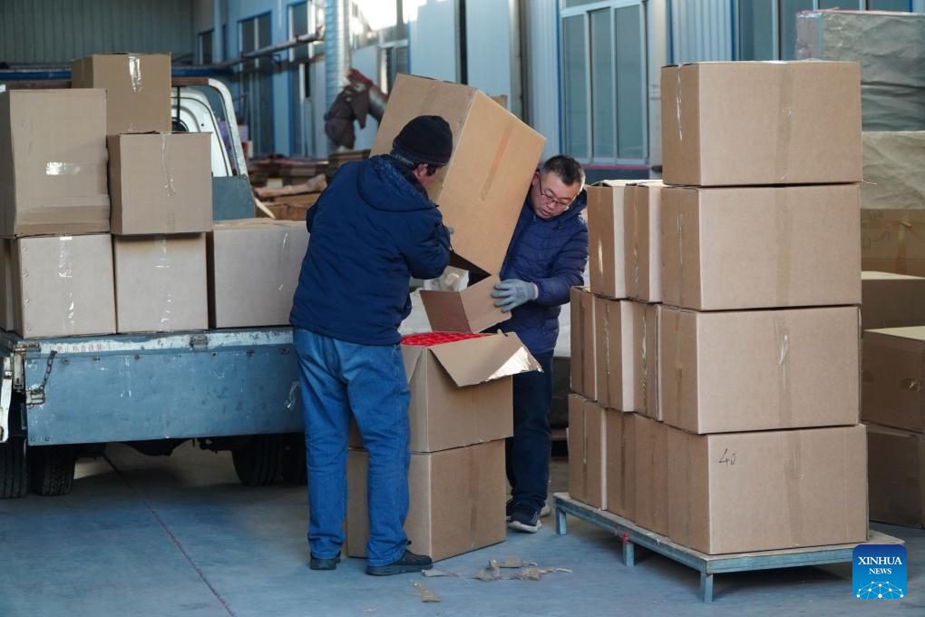 Workers pack Spring Festival couplets and posters in Donglijia Village of Gaomi City, east China's Shandong Province, on Jan. 24, 2024. As the Spring Festival is approaching, workers have been busy producing Spring Festival couplets and posters with good blessings for the upcoming lunar new year in Gaomi, a major producing base in Shandong Province. The Spring Festival couplets and posters producing industry here yields almost 8000 tonnes annually with an output value of nearly 100 million yuan (13.9 million U.S. dollars). It has become a characteristic industry increasing villagers' income. (Xinhua/Xu Suhui)