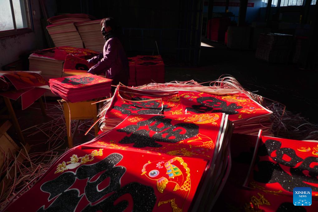 A worker packs Spring Festival posters in Donglijia Village of Gaomi City, east China's Shandong Province, on Jan. 24, 2024. As the Spring Festival is approaching, workers have been busy producing Spring Festival couplets and posters with good blessings for the upcoming lunar new year in Gaomi, a major producing base in Shandong Province. The Spring Festival couplets and posters producing industry here yields almost 8000 tonnes annually with an output value of nearly 100 million yuan (13.9 million U.S. dollars). It has become a characteristic industry increasing villagers' income. (Xinhua/Xu Suhui)