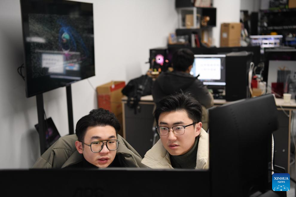 Yang Yuanfan (R) communicates with a member of his company in Hefei, east China's Anhui Province, Jan. 18, 2024. (Xinhua/Zhang Duan)