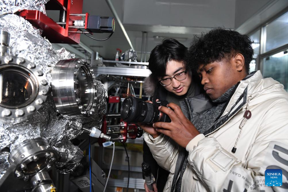 Yang Yuanfan (L) and an international student from Madagascar create a scientific visualization product at University of Science and Technology of China in Hefei, east China's Anhui Province, Dec. 29, 2023. (Photo by Guo Ruqi/Xinhua)