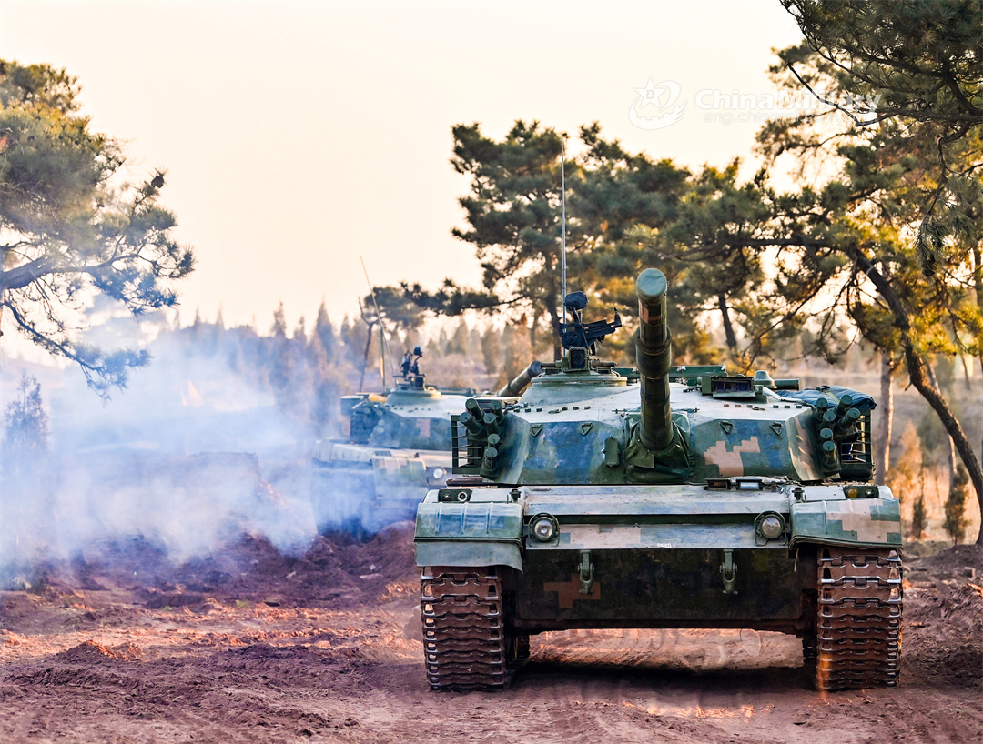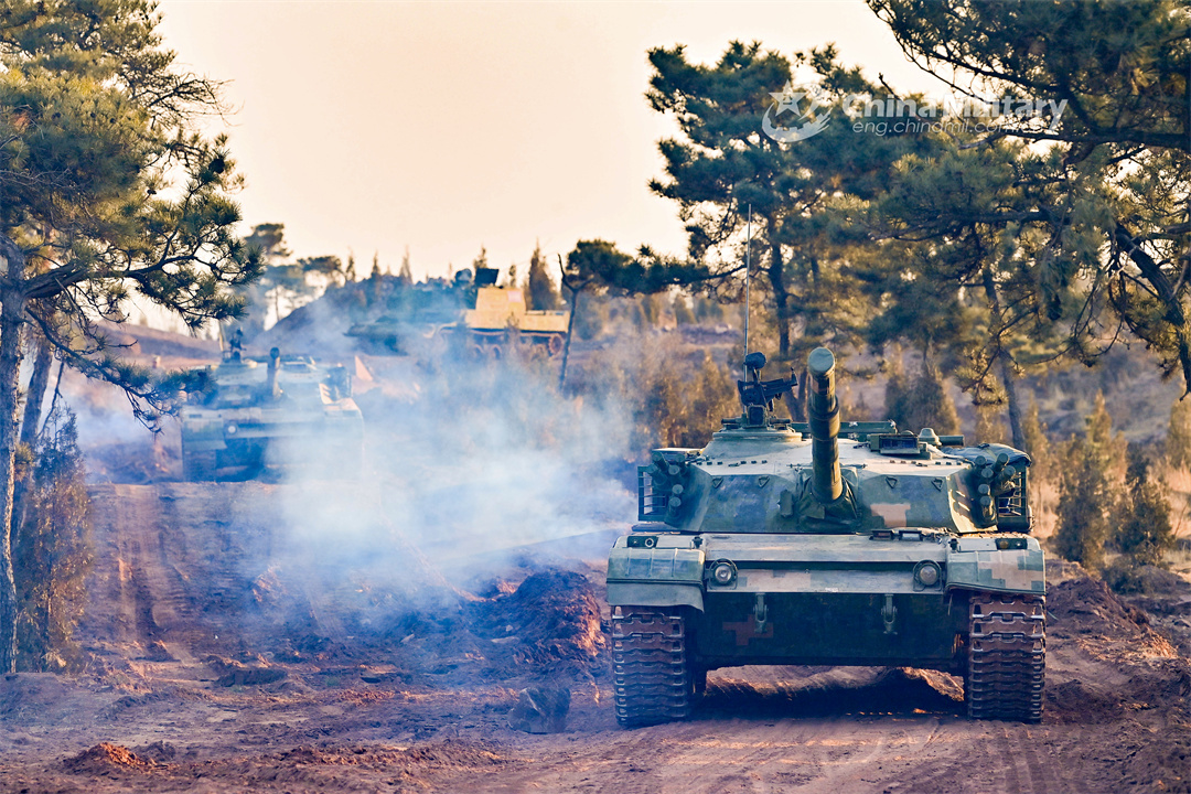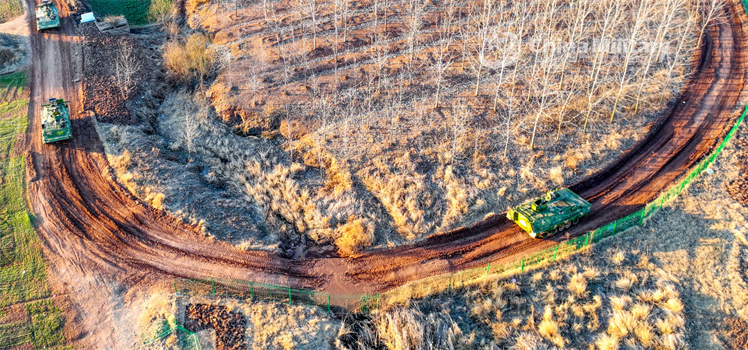 Armored vehicles attached to a brigade under the PLA 71st Group Army speed to designated areas during a long-distance maneuver training exercise on January 10, 2024. (eng.chinamil.com.cn/Photo by Zhao Genyuan)