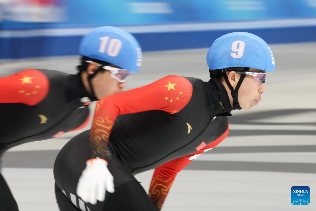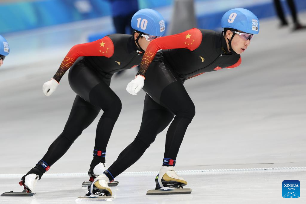 Pan Baoshuo and Zhang Wanli (R) of China compete during the men's mass start final of speed skating event at the Gangwon 2024 Winter Youth Olympic Games in Gangneung, South Korea, Jan. 26, 2024. (Xinhua/Xu Yanan)