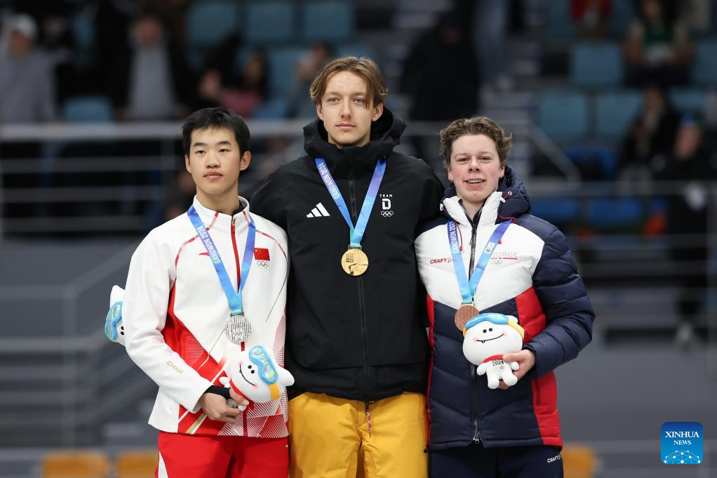 Silver medalist Pan Baoshuo of China, gold medalist Finn Sonnekalb of Germany and bronze medalist Eirik Andersen of Norway (L to R) pose for photos during the victory ceremony for the men's mass start of speed skating at the Gangwon 2024 Winter Youth Olympic Games in Gangneung, South Korea, Jan. 26, 2024. (Xinhua/Xu Yanan)