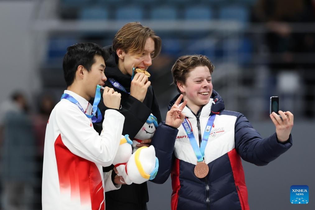 Silver medalist Pan Baoshuo of China, gold medalist Finn Sonnekalb of Germany and bronze medalist Eirik Andersen of Norway (L to R) take a selfie during the victory ceremony for the men's mass start of speed skating at the Gangwon 2024 Winter Youth Olympic Games in Gangneung, South Korea, Jan. 26, 2024. (Xinhua/Xu Yanan)