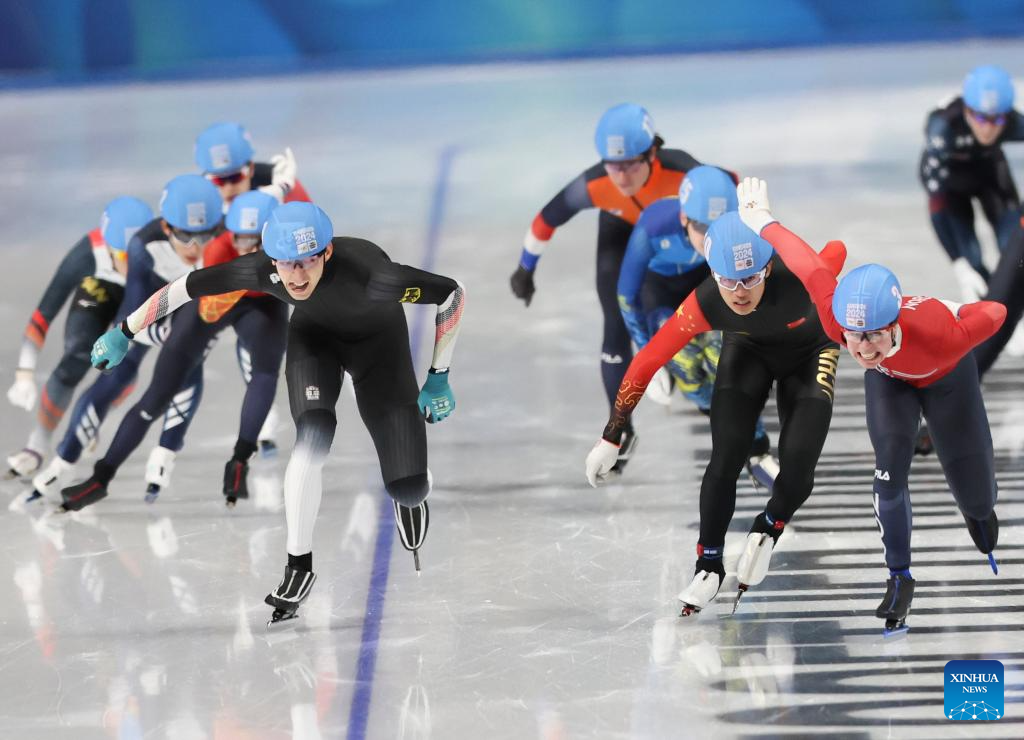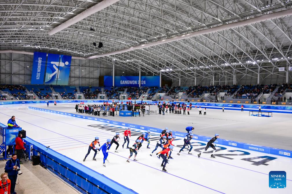 Skaters compete during the men's mass start final of speed skating event at the Gangwon 2024 Winter Youth Olympic Games in Gangneung, South Korea, Jan. 26, 2024. (Xinhua/Zhu Wei)