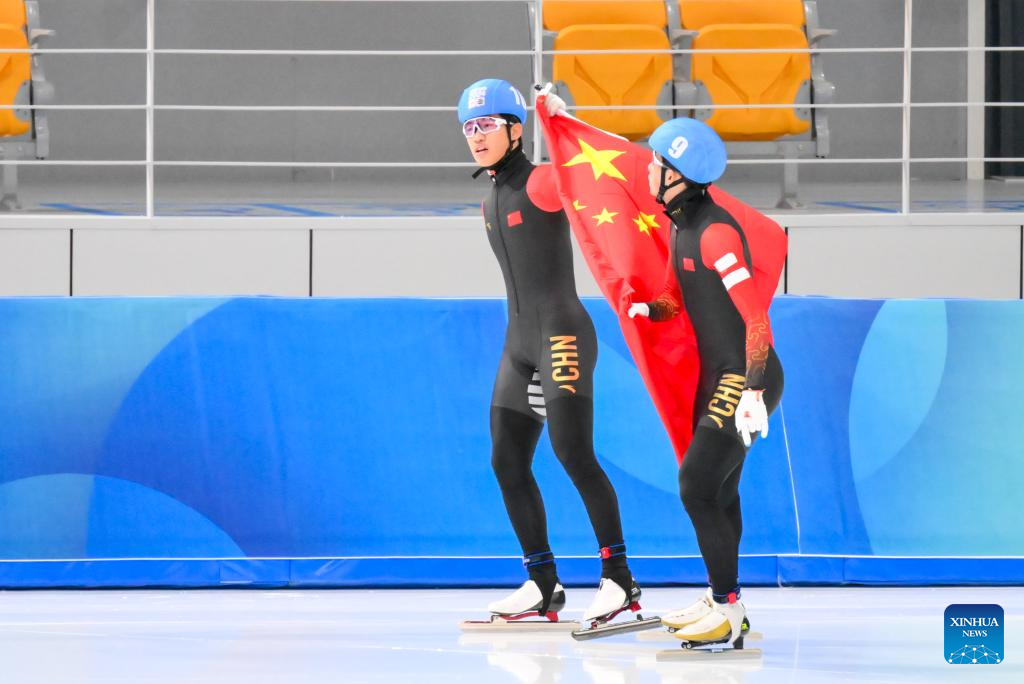 Pan Baoshuo (L) and Zhang Wanli of China celebrate after the men's mass start final of speed skating event at the Gangwon 2024 Winter Youth Olympic Games in Gangneung, South Korea, Jan. 26, 2024. (Xinhua/Zhu Wei)