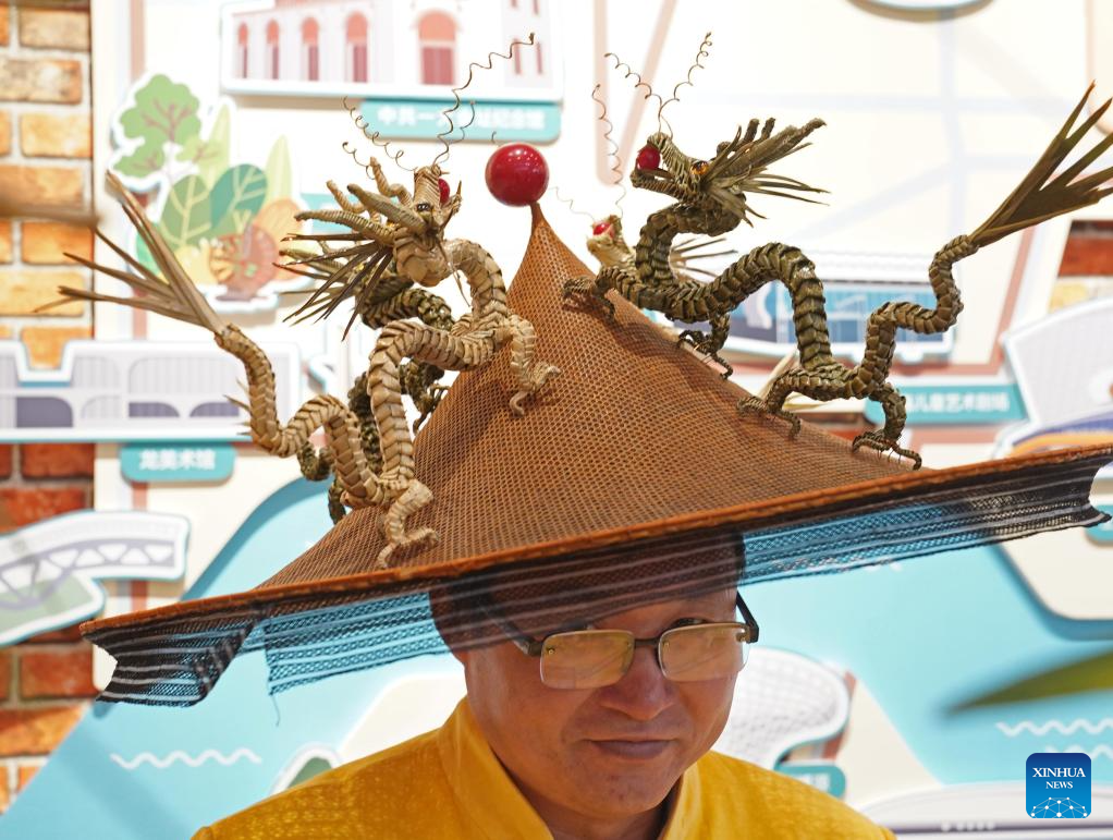An inheritor of intangible cultural heritage shows his hat under the theme of "Year of the Dragon" during an exhibition of Chinese New Year customs at Shanghai Mass Art Center in Shanghai, east China, Jan. 28, 2024. Hundreds of exhibits including photos and unique products of Shanghai have been displayed at the exhibition to show Chinese New Year customs in Shanghai. (Xinhua/Liu Ying)