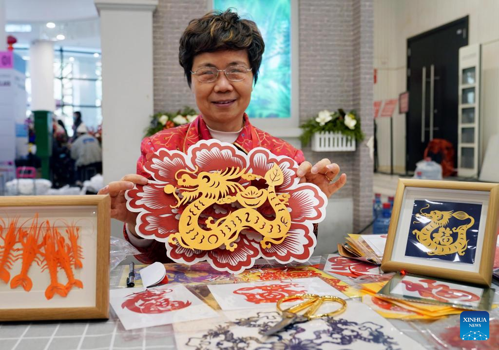 A craftsperson shows paper cutting works during an exhibition of Chinese New Year customs at Shanghai Mass Art Center in Shanghai, east China, Jan. 28, 2024. Hundreds of exhibits including photos and unique products of Shanghai have been displayed at the exhibition to show Chinese New Year customs in Shanghai. (Xinhua/Liu Ying)