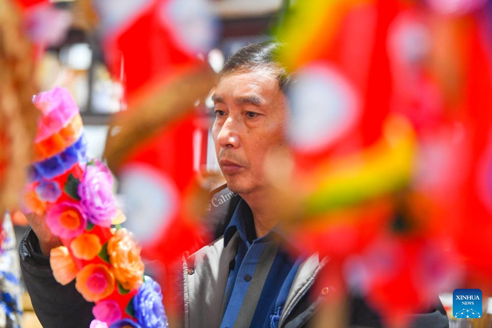Chen Jianyou displays dragon and phoenix candles at his workshop in southwest China's Chongqing, Jan. 24, 2024. (Xinhua/Wang Quanchao)