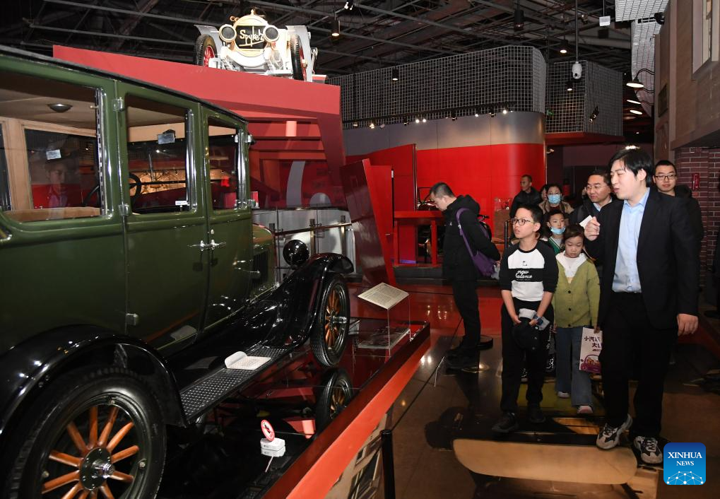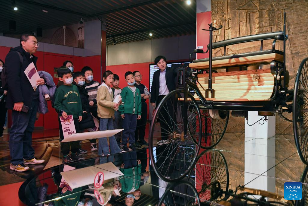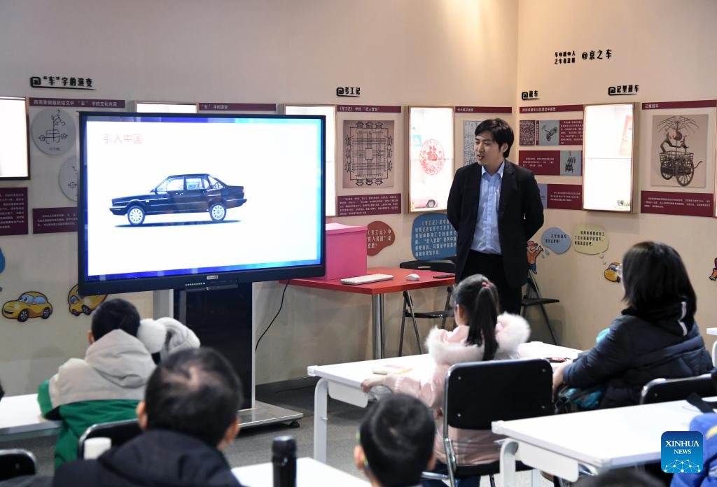 Children learn about automobile knowledge at Beijing Auto Museum in Beijing, capital of China, Jan. 28, 2024. Many children visit Beijing Auto Museum with their parents during this winter vacation to attend popular-science lectures and learn about automobile knowledge. (Xinhua/Ren Chao)