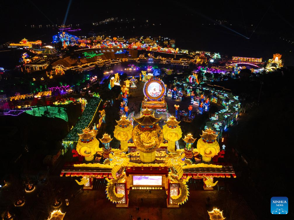 A drone photo taken on Jan. 26, 2024 shows light installations for an upcoming lantern show in Zigong, southwest China's Sichuan Province. The city of Zigong is well known for the large number of dinosaur fossils that have been unearthed in past decades. (Xinhua/Shen Bohan)