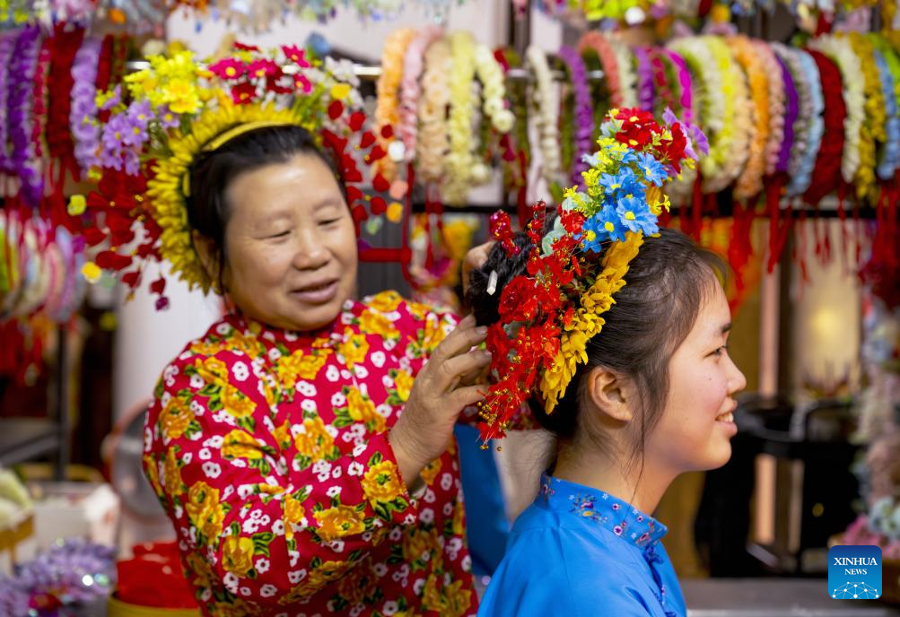 A villager pins a flowery headwear for a tourist at Xunpu Village of Quanzhou City, southeast China's Fujian Province, Jan. 26, 2024. Xunpu flowery headwear, dubbed "overhead gardens," have been a signature of "Xunpu Women Customs" listed as a national intangible heritage in 2008. They attracted millions of eyes in the cyber world in early 2023, followed by a sustainable tourist boom in the village, where visitors are able to literally fit their heads in them. Photo-shooting, dining and other hospitality services have diversified the source of income for residents of this small costal village that used to rely on fishing and mudflat aquaculture. (Xinhua/Wei Peiquan)
