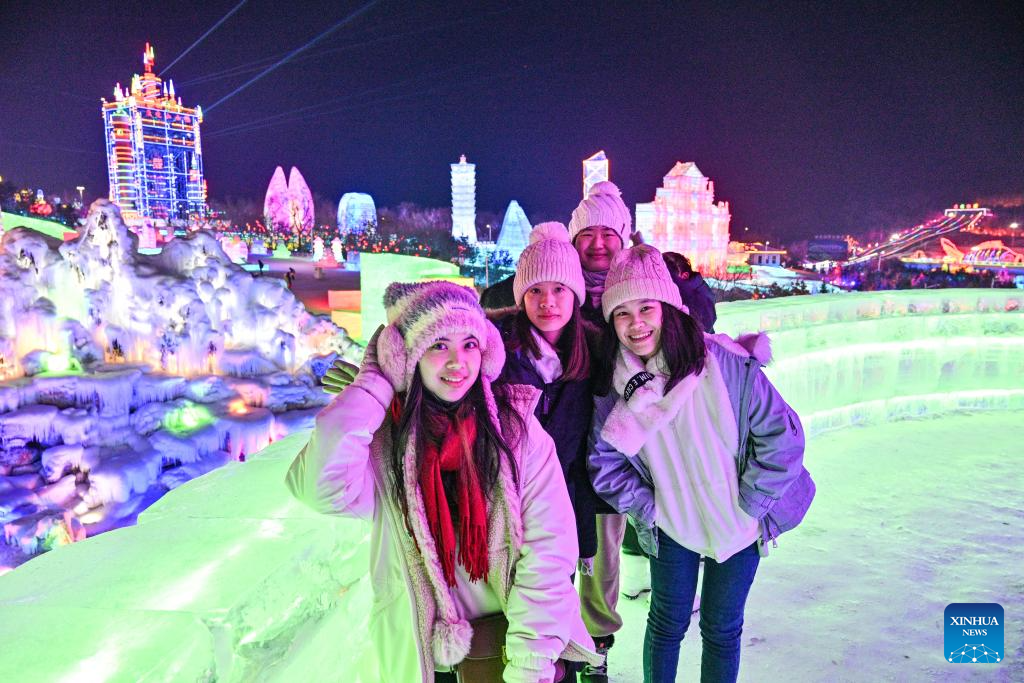Taiwan students pose for a photo at an ice and snow park in Changchun, northeast China's Jilin Province on Jan. 26, 2024. (Xinhua/Chen Yehua)