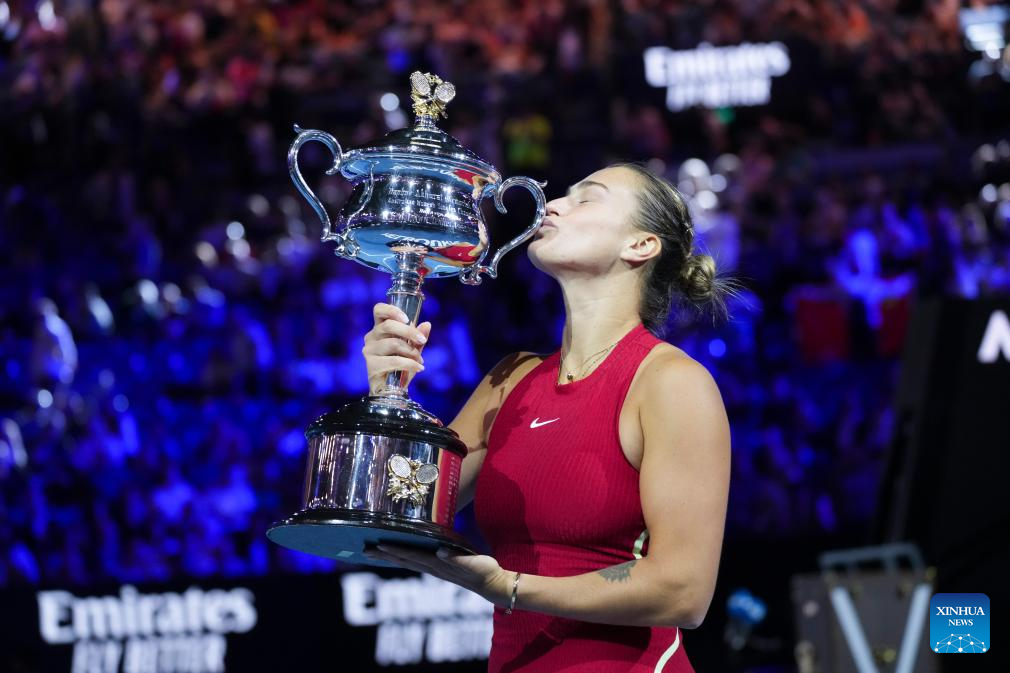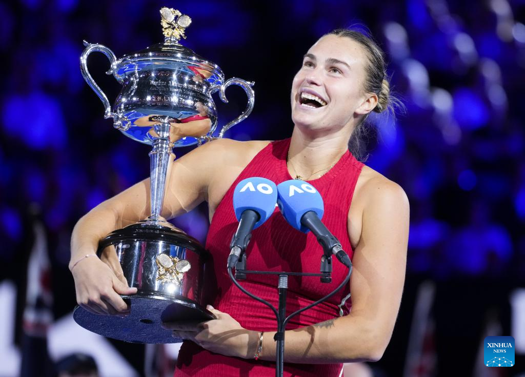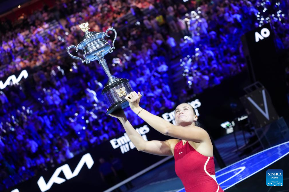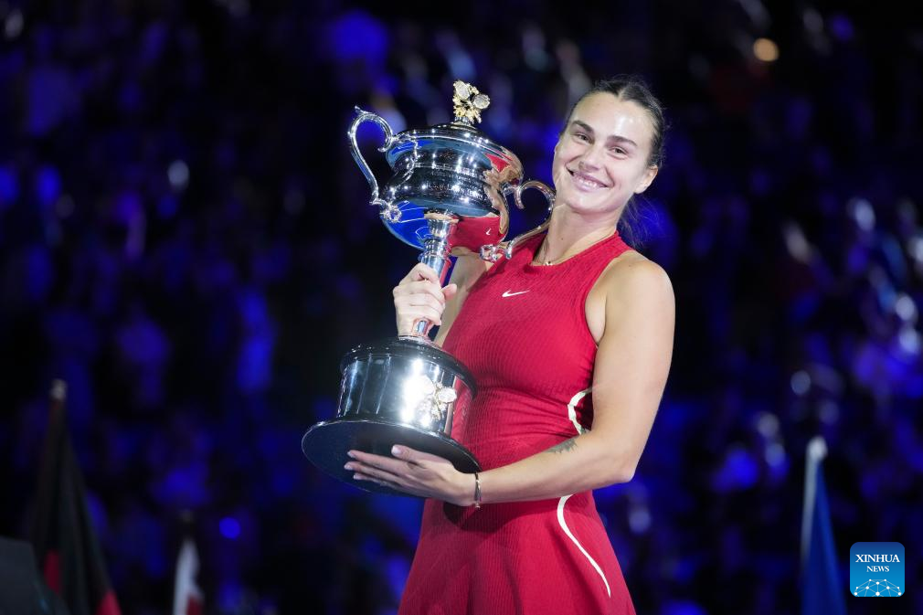 Aryna Sabalenka of Belarus poses with her champion trophy during the awarding ceremony for the women's singles final at Australian Open tennis tournament in Melbourne, Australia, Jan. 27, 2024. (Xinhua/Wang Shen)