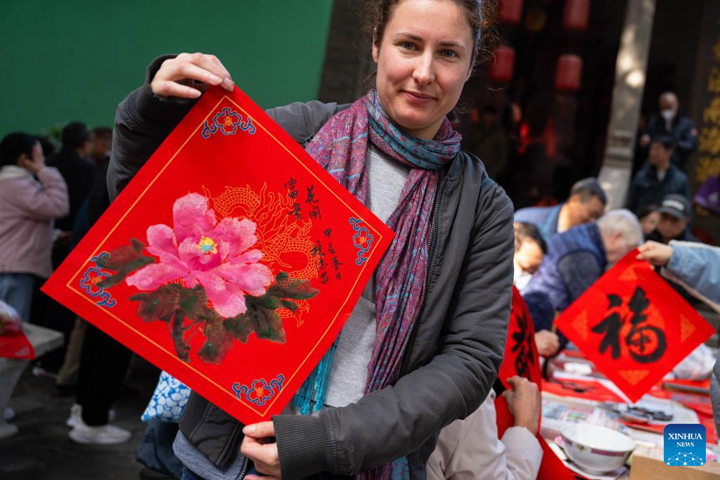 A person holds a piece of red paper with painting and calligraphy during a cultural event in Macao, south China, Jan. 28, 2024. More than 30 calligraphers participated in a cultural event in Macao on Sunday to celebrate the upcoming Chinese Spring Festival. (Xinhua/Cheong Kam Ka)