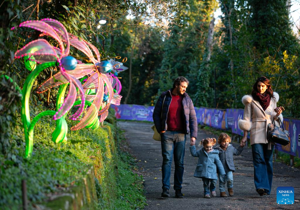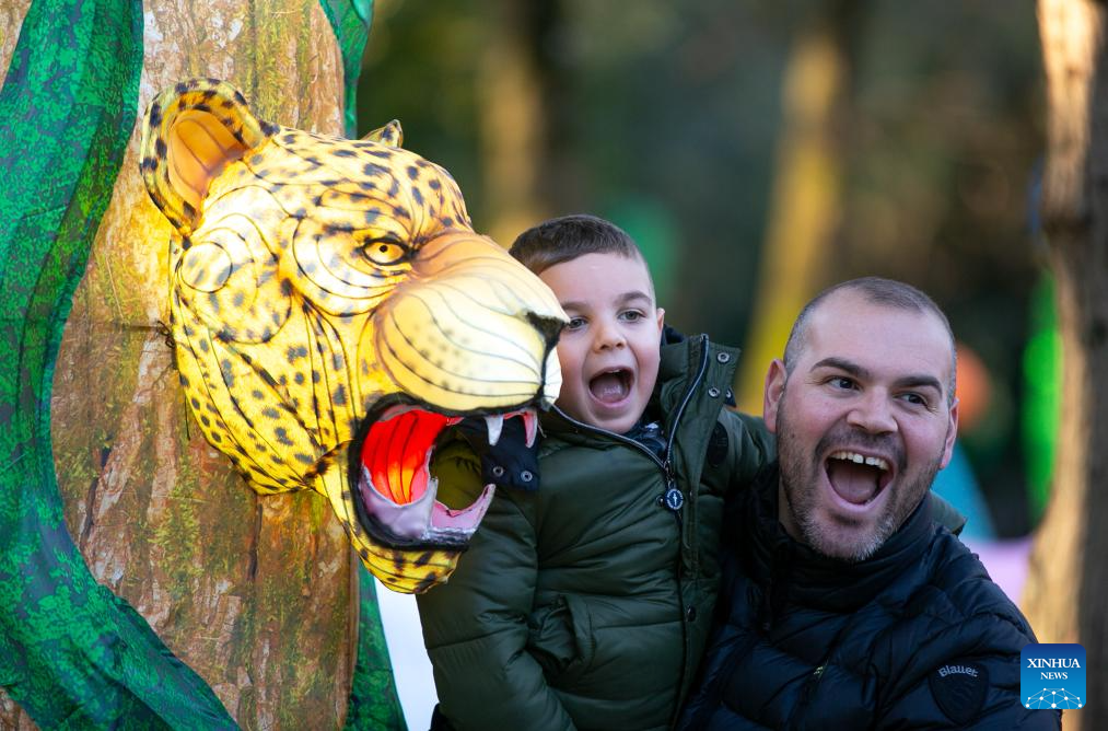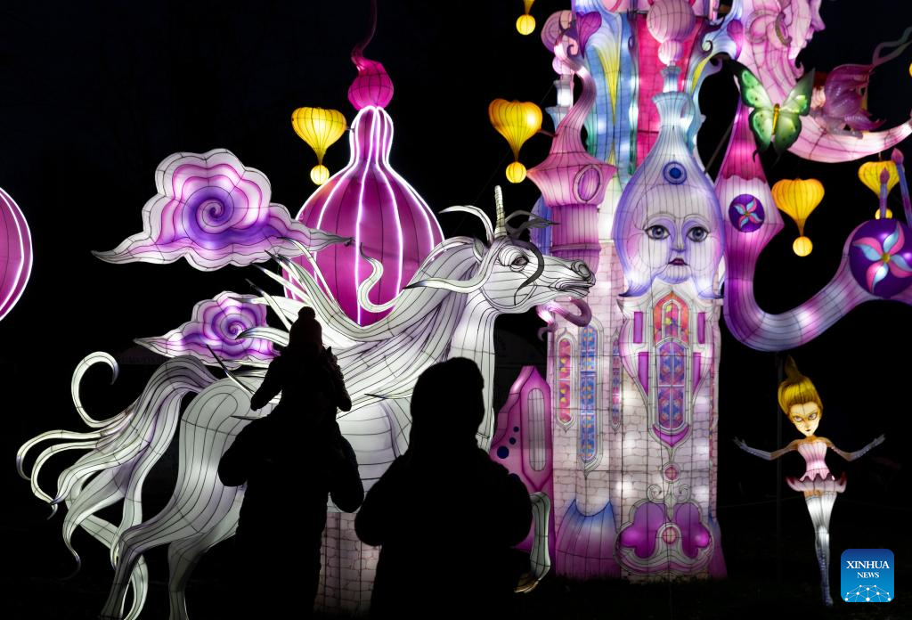 Visitors look at a lantern during the International Lantern Festival "Lanternia" in Cassino, central Italy, Jan. 28, 2024. More than 300 Chinese lanterns made by artisans from Zigong, a southwest China's city famous for its lantern making, are exhibited here. Since its opening on Dec. 8, 2023, the lantern show has attracted approximately 80,000 visitors. (Xinhua/Li Jing)