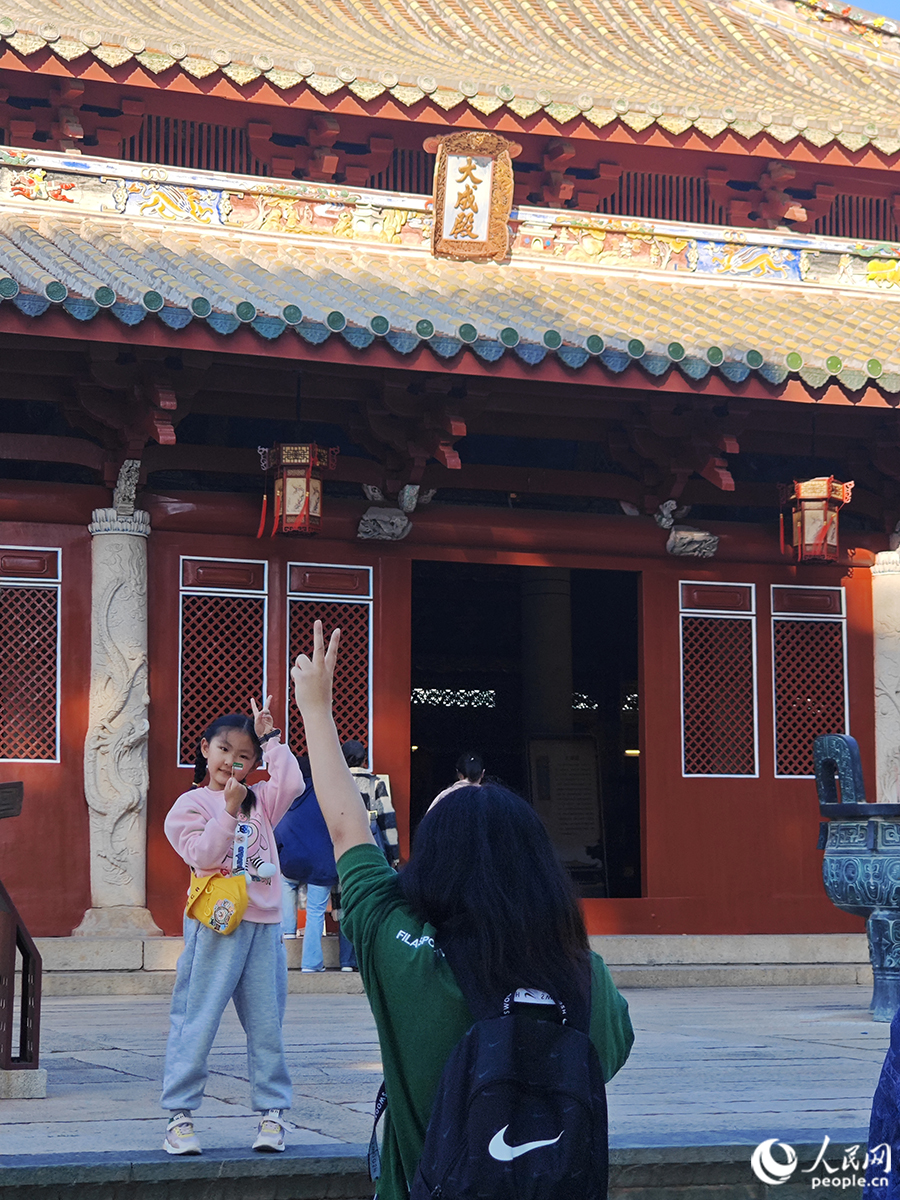 A girl poses for photos in front of the Dacheng Hall of the Confucius Temple in Quanzhou, southeast China's Fujian Province. (People's Daily Online/Huang Dongyi)