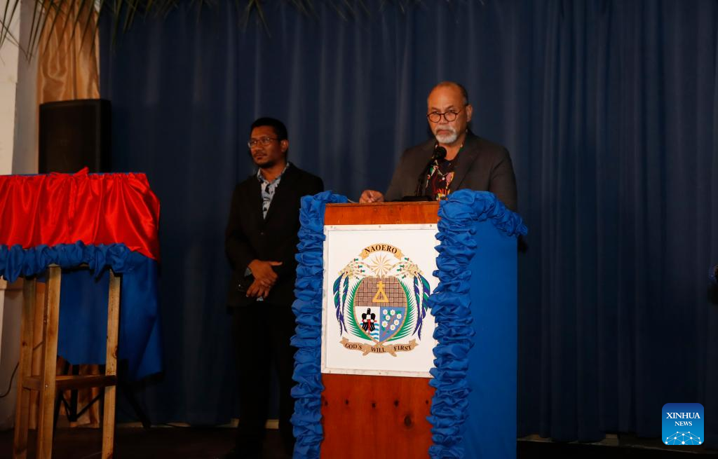Nauru's Minister for Foreign Affairs and Trade Lionel Aingimea speaks during the reopening ceremony of the Chinese embassy in Nauru held in a hotel in Nauru, Jan. 29, 2024. The reopening ceremony of the Chinese embassy in Nauru was held on Monday evening in a hotel in the southeastern part of the Pacific island country. (Photo by Chen Guolong/Xinhua)