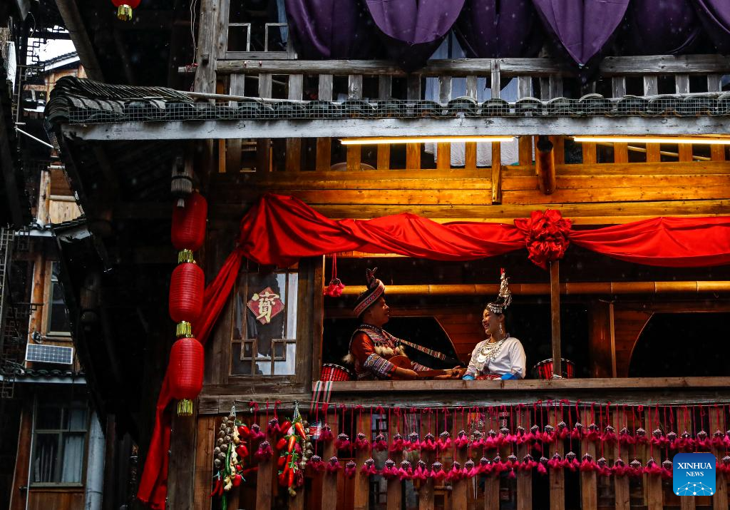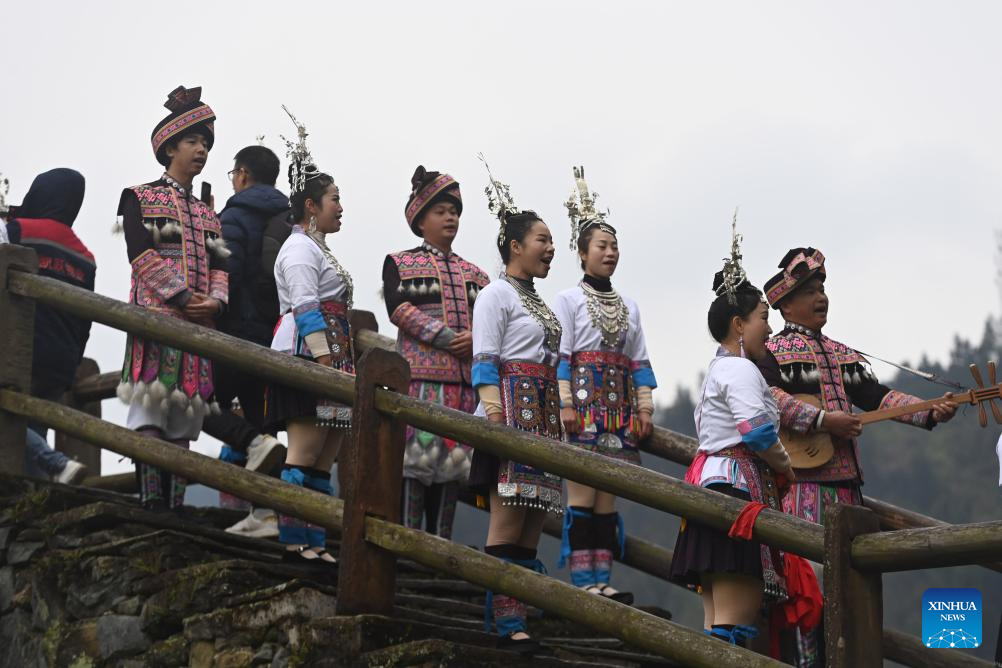Performers sing songs of Dong ethnic group to welcome tourists in Sanjiang Dong Autonomous County, Liuzhou City of south China's Guangxi Zhuang Autonomous Region, Jan. 28, 2024. (Xinhua/Hu Xingyu)