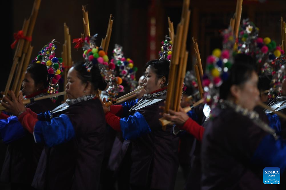 A troupe of artists play lusheng, a reed-pipe wind instrument, in Sanjiang Dong Autonomous County, Liuzhou City of south China's Guangxi Zhuang Autonomous Region, Jan. 28, 2024. (Xinhua/Hu Xingyu)