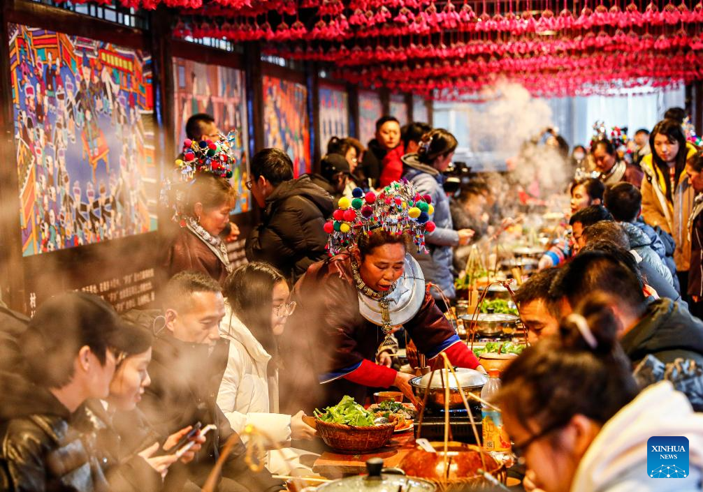 Tourists enjoy banquets in Sanjiang Dong Autonomous County, Liuzhou City of south China's Guangxi Zhuang Autonomous Region, Jan. 28, 2024. (Xinhua/Hu Xingyu)