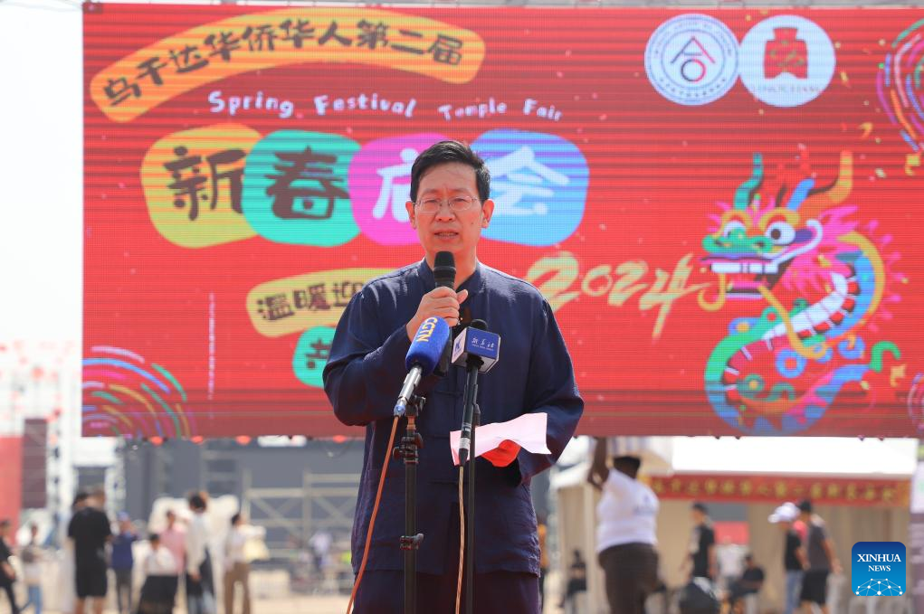 Chinese Ambassador to Uganda Zhang Lizhong speaks at the Chinese New Year temple fair in Kampala, Uganda, on Jan. 28, 2024. (Photo by Hajarah Nalwadda/Xinhua)