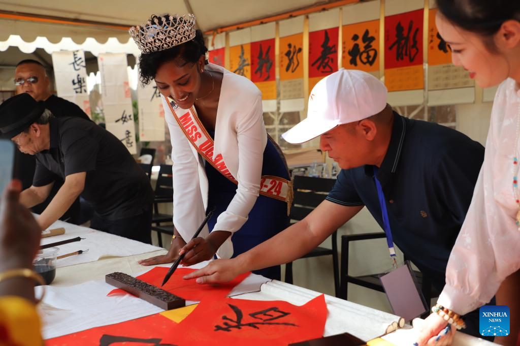 Hannah Tumukunde, the newly-crowned Miss Uganda 2023, learns Chinese calligraphy at the Chinese New Year temple fair in Kampala, Uganda, on Jan. 28, 2024. (Photo by Hajarah Nalwadda/Xinhua)