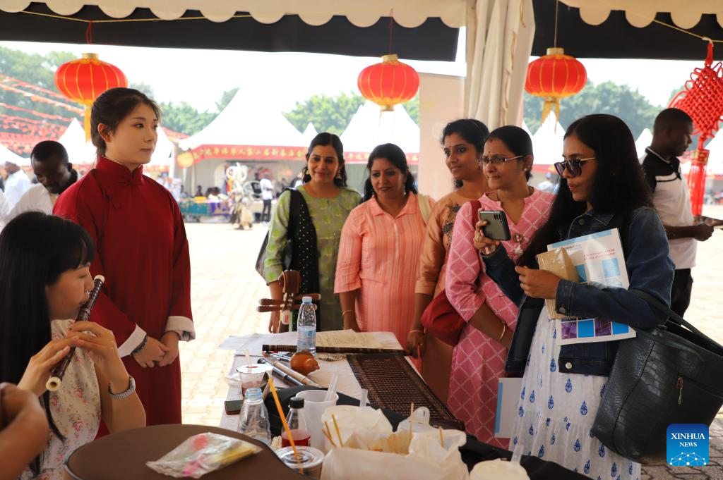 Visitors watch a traditional Chinese instrument performance at the Chinese New Year temple fair in Kampala, Uganda, on Jan. 28, 2024. (Photo by Hajarah Nalwadda/Xinhua)