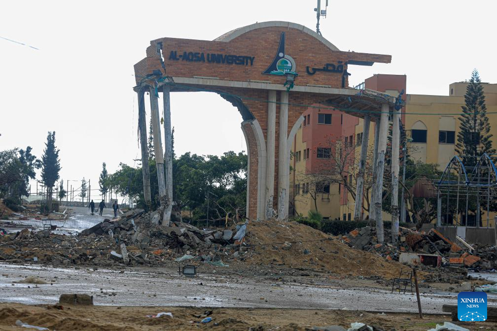 A university gate is seen destroyed in the southern Gaza Strip city of Khan Younis, on Jan. 29, 2024. The Hamas-run Health Ministry in Gaza said on Monday that the Palestinian death toll from the Israeli offensive on the enclave has reached 26,637 since it began on Oct. 7, 2023. (Photo by Rizek Abdeljawad/Xinhua)