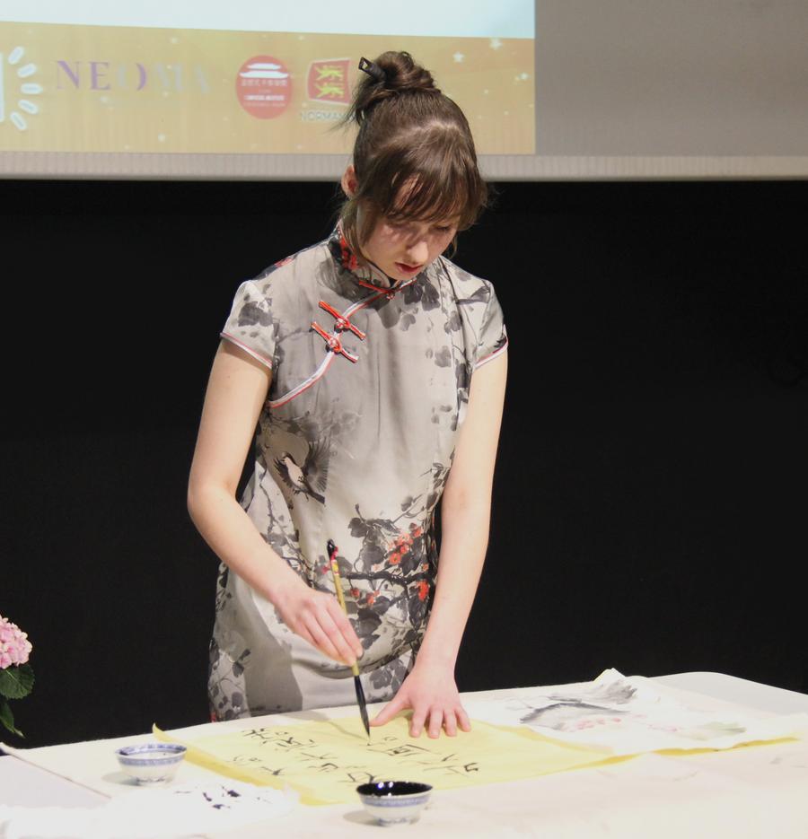 A contestant creates Chinese painting and calligraphy during the preliminary competition for the 15th "Chinese Bridge" Chinese Proficiency Competition for Foreign College Students in Rouen, France, May 28, 2016. (Xinhua/Zhang Xuefei)