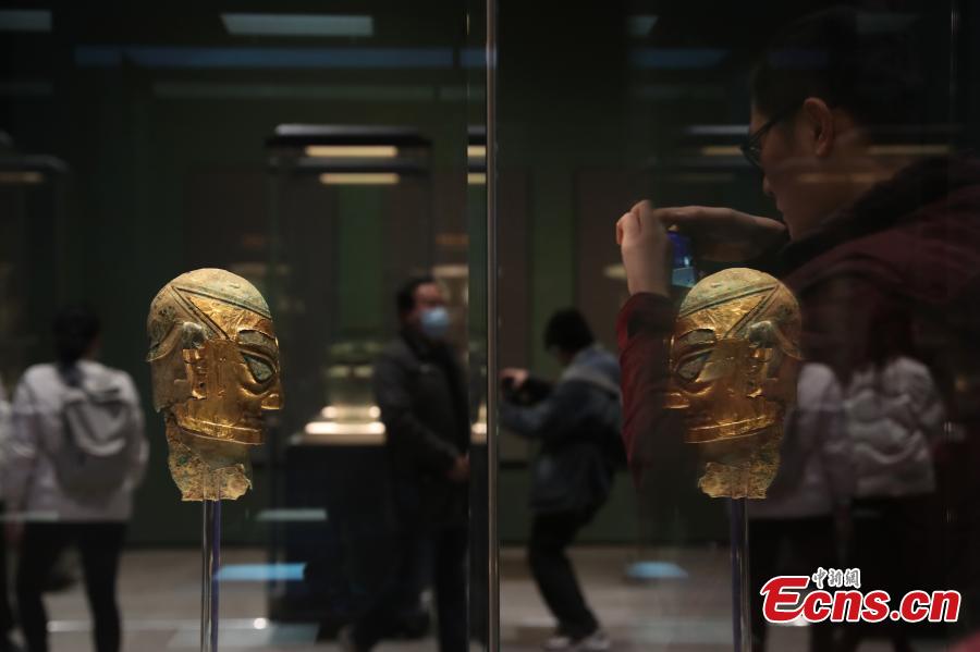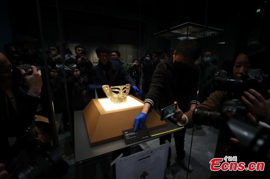 A staff member arranges a golden mask discovered at the No. 3 sacrificial pit of the Sanxingdui Ruins at East branch of the Shanghai Museum, Jan. 29, 2024. (Photo: China News Service/Zhang Hengwei)