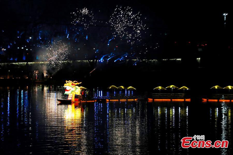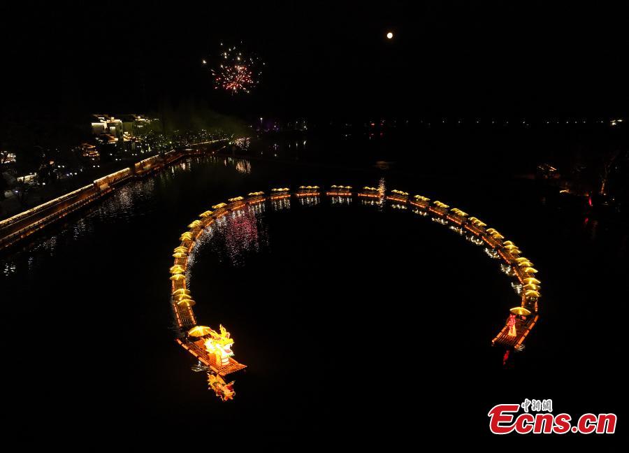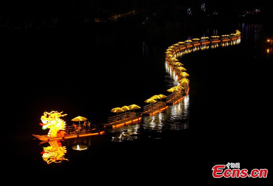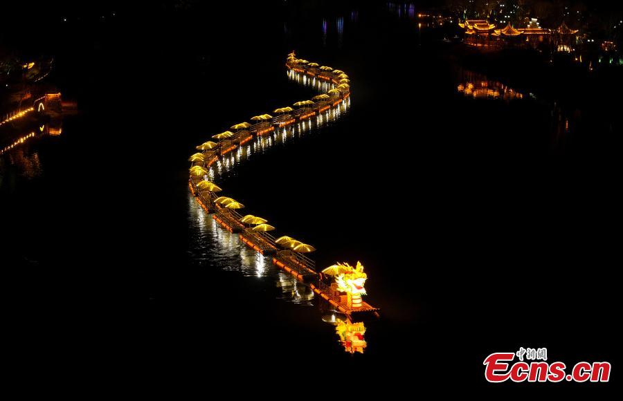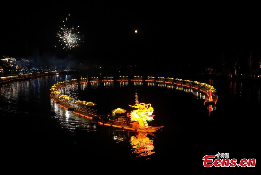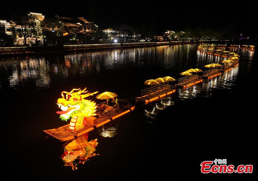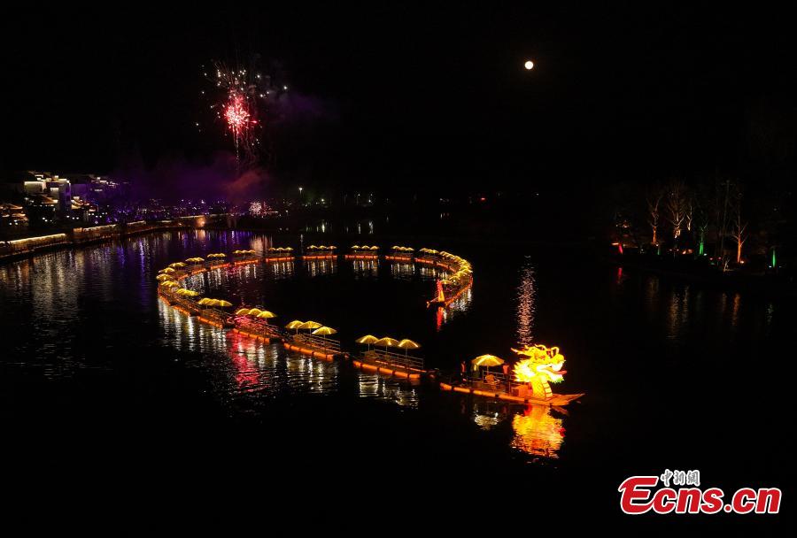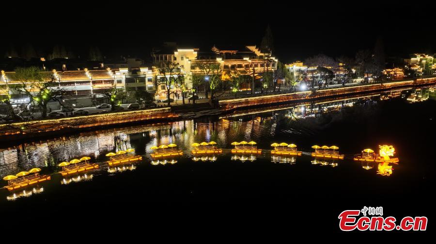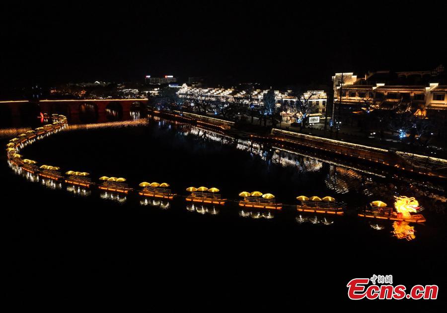 A 200-meter-long fleet of lit-up boats with a dragon head rafting along Hengjiang River at night adds a festive atmosphere in Huangshan, east China's Anhui Province, Jan. 27, 2024. (Photo: China News Service/Shi Yalei)