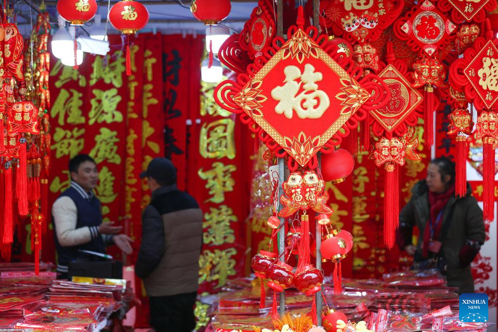 People select Chinese Lunar New Year decorations at a market in Duyun City, southwest China's Guizhou Province, Jan. 29, 2024. The Chinese Lunar New Year, or Spring Festival, falls on Feb. 10 this year. (Photo by Xiao Wei/Xinhua)