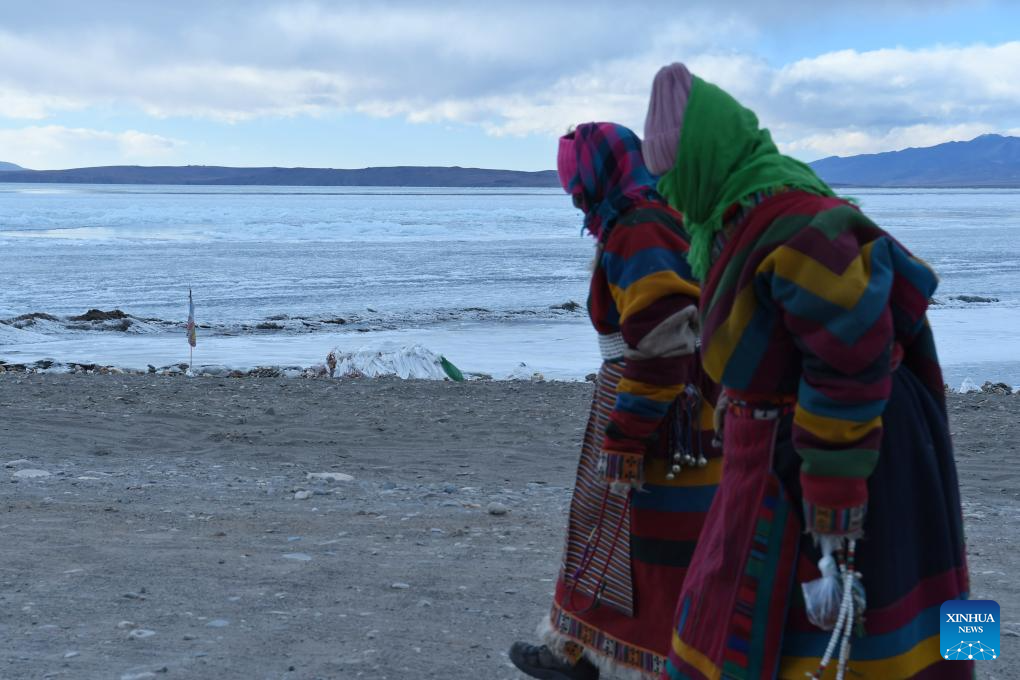 People walk past the Mapam Yumco Lake in Burang County of Ngari Prefecture, southwest China's Xizang Autonomous Region, Jan. 29, 2024.?(Xinhua/Liu Wenbo)