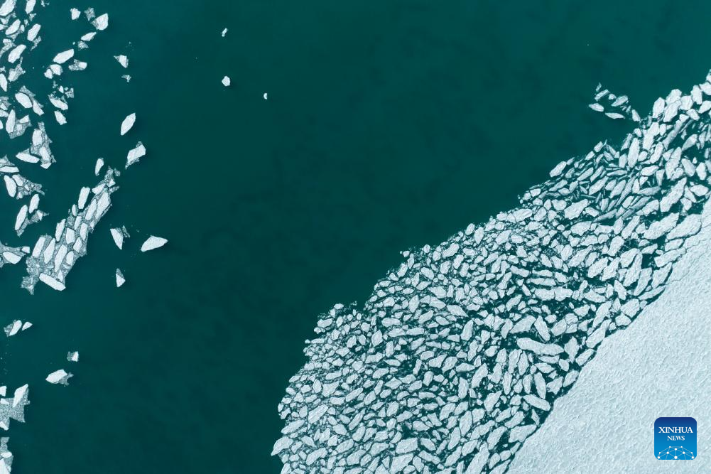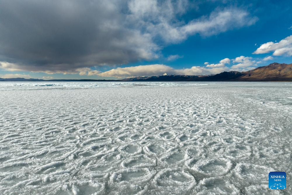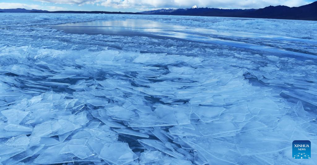 This drone photo taken on Jan. 29, 2024 shows piled-up ice in different patterns on the Mapam Yumco Lake in Burang County of Ngari Prefecture, southwest China's Xizang Autonomous Region.?(Photo by Tenzin Norbu/Xinhua)