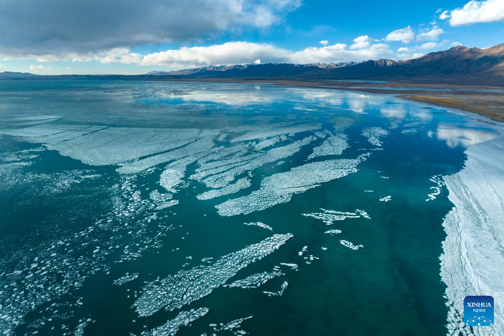 This photo taken on Jan. 29, 2024 shows winter scenery of the Mapam Yumco Lake in Burang County of Ngari Prefecture, southwest China's Xizang Autonomous Region.?(Xinhua/Liu Wenbo)