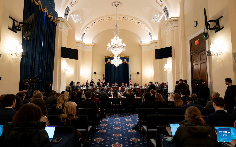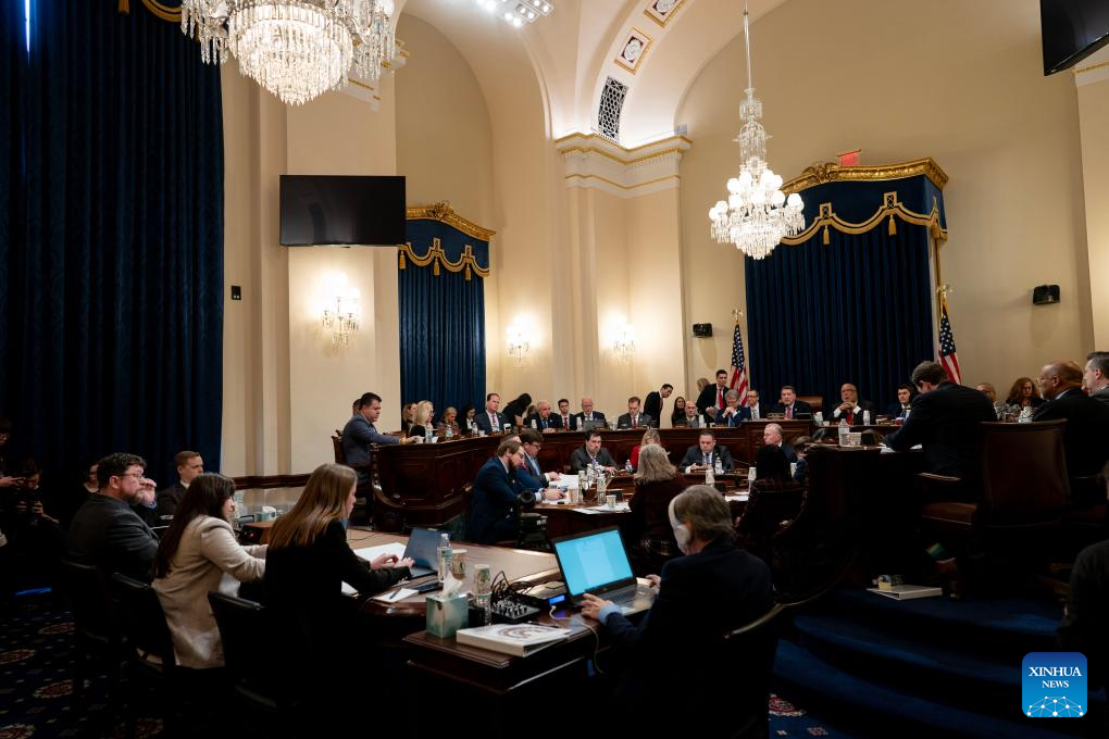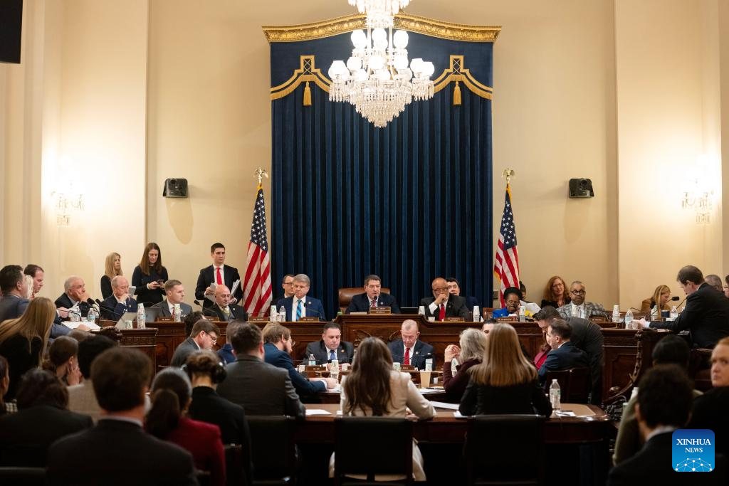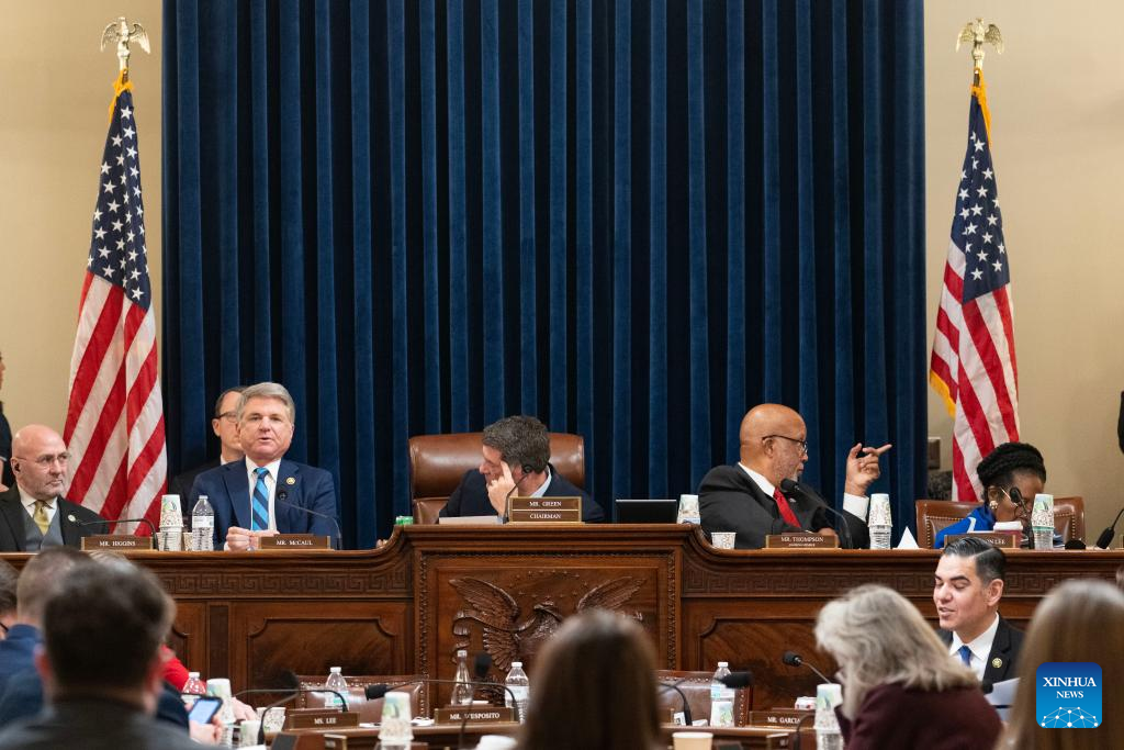Photo taken on Jan. 30, 2024 shows a U.S. House Homeland Security Committee meeting to impeach Homeland Security Secretary Alejandro Mayorkas over the crisis at the U.S.-Mexico border, on Capitol Hill in Washington, D.C., the United States. Republicans in the U.S. House announced impeachment charges against Homeland Security Secretary Alejandro Mayorkas, accusing him of "willfully and systematically refusing to obey the law" on immigration issues, leading to a failure to control immigration at the U.S.-Mexico border. (Xinhua/Liu Jie)